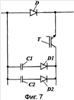 На фиг.7 показан вариант цепи, представленной на фиг.6, в которой два разных конденсатора (Cl, C2) подключены через общий переключатель или БТИЗ (Т).