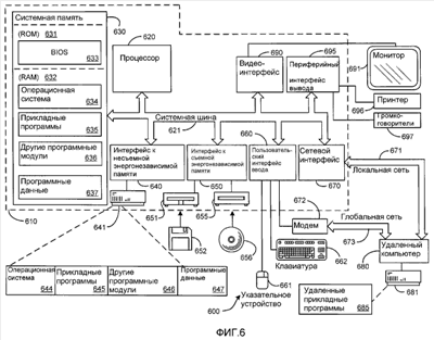Указанный компьютер 610 может также включать другие съемные/несъемные энергозависимые/энергонезависимые компьютерные носители для хранения. В качестве примера и только, ФИГ.6 изображает накопитель 641 на жестких дисках, который читает с или записывает на несъемный энергонезависимый магнитный носитель, накопитель 651 на магнитных дисках, который читает с или записывает на съемный энергонезависимый магнитный диск 652, и накопитель 655 на оптических дисках, который читает с или записывает на съемный энергонезависимый оптический диск 656, такой как CD-ROM или другой оптический носитель.