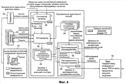 На Фиг.4 приведена архитектура программного адаптивного модуля 20, показанного на Фиг.3. Оценка радиоресурсов проводится с помощью датчика 34 на основе уровня мощности, частоты и времени с целью определения доступных или недоступных ресурсов. Эти данные передаются в предиктор 36 для подачи частотного/временного анализа в синтезатор 38 каналов. Синтезатор 38 каналов также получает информацию о ресурсах беспроводной связи и факторах среды дополнительно к обратной связи относительно изменения условий среды, например, наблюдаемого качества и класса предоставляемых услуг передачи данных. Синтезатор 38 каналов осуществляет вывод частот и времени каналов на оптимизатор 40, взаимодействующий с соседними устройствами 42 и получающий входную информацию из очереди 44 отложенных сообщений. Оптимизатор 40 выводит список 46 выделенных каналов/каналов с произвольным доступом, связанный с прогнозирующим распределителем 48 и распределителем 50 текущего канала. Прогнозирующий распределитель 48 также получает данные из очереди 44 отложенных сообщений, например, средняя пиковая нагрузка, типы сообщений и пункт назначения. Прогнозирующий распределитель реагирует путем вывода конкретных запросов на наблюдения за временем/частотой для дальнейшего использования. Распределитель 50 текущего канала также получает фактическую передаваемую информацию по входному каналу и выдает на радиоустройство 16 команды на передачу, включающие сообщения, полосу частоты канала, форму сигнала, мощность и модуляцию.