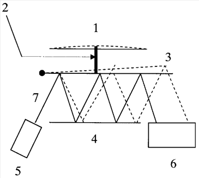 Оптический луч (7), распространяясь между зеркальными пластинами (3) и (4) путем последовательного отражения от каждой из них, освещает входной зрачок фотоприемника (6). Колебания мембраны, возникающие под воздействием звуковых волн, через стержень передаются зеркальной пластине (3) и вызывают либо ее угловые колебания, как это показано на чертеже, либо колебания, осуществляемые посредством плоскопараллельного переноса пластины. В первом случае увеличение амплитуды отклонения оптического луча относительно фотоприемника при его распространении между зеркальными пластинами происходит за счет увеличения дальности между точкой первого отражения луча от пластины (3) и фотоприемником, а также за счет того, что при каждом отражении оптического луча от этой пластины изменяется его направление на величину 2 , где  – угол отклонения пластины (3). Во втором случае увеличение амплитуды пространственных колебаний оптического луча относительно фотоприемника происходит за счет сдвига точек его отражения от пластин, величина которого зависит от амплитуды колебаний пластины (3) и количества отражений от нее оптического луча.