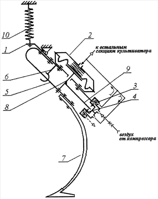 На фиг.1 схематично изображена секция культиватора с диафрагменным пневмоприводом и регулятором. Регулятор может быть установлен только на одной секции культиватора. Секция состоит из шарнирно закрепленного на раме машины двуплечего кронштейна 1, с установленным на его нижнем плече диафрагменным пневмоприводом 2 и регулятором с впускным 3 и выпускным 4 клапанами. К заднему плечу кронштейна 1 крепится короткое плечо упругой скобы 5 и двуплечий вильчатый упор 6. К длинному плечу упругой скобы 5 крепится стойка рабочего органа 7 и шток 8 пневмопривода 2. На штоке 8 жестко установлена нажимная пластина 9. С передним плечом кронштейна 1 соединена предохранительная пружина 10. К регулятору по трубопроводу под давлением подводится воздух (например, от компрессора трактора). Впускной клапан трубопровода 3 связан с диафрагменными пневмоприводами 2 всех секций машины и выпускным клапаном 4.