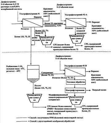 Таким образом, в дополнительном аспекте настоящего изобретения обеспечивается способ получения изолята белка канолы, который включает (а) обеспечение водного раствора белка канолы, полученного из муки из масличных семян канолы и содержащего белки канолы 12S, 7S и 2S; (б) повышение концентрации белка в водном растворе с использованием селективной мембранной технологии, которая является эффективной для удерживания белков канолы 7S и 12S в ретентате и пропускания белка 2S через мембрану в виде пермеата с обеспечением концентрированного белкового раствора; (в) сушку ретентата со стадии (б) с получением изолята белка канолы, состоящего преимущественно из белка канолы 7S и имеющего содержание белка, по меньшей мере, примерно 90 мас.% (N×6,25) в сухом веществе (d.b.); (г) повышение концентрации пермеата со стадии (а) с использованием селективной мембранной технологии, которая является эффективной для удерживания белка канолы 2S в ретентате и пропускания через мембрану низкомолекулярных загрязняющих веществ в пермеат, и (д) сушку ретентата со стадии (г) с обеспечением изолята белка канолы, состоящего преимущественно из белка 2S и имеющего содержание белка, по меньшей мере, примерно 90 мас.% (N×6,25) d.b.
