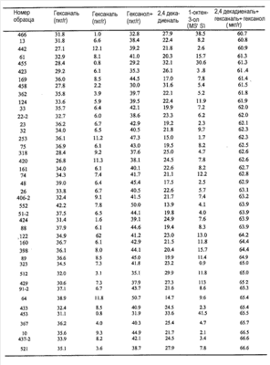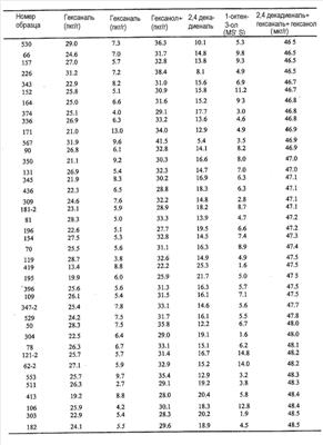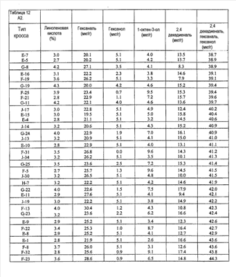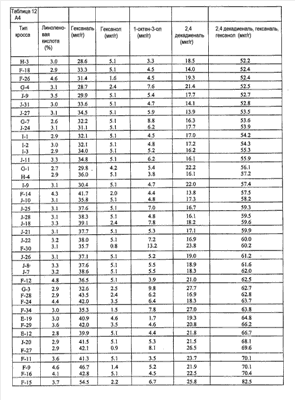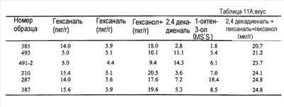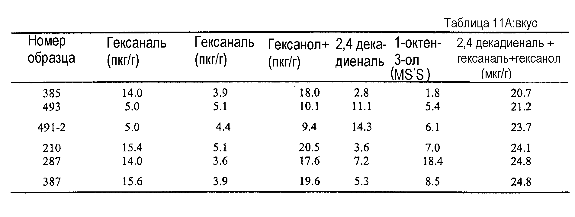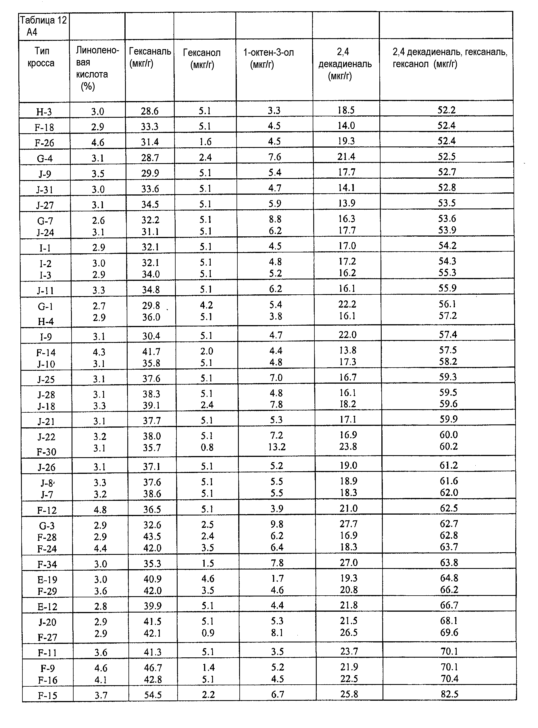 менее 30 и продуцирующие менее 20 мкг/г 2,4-декадиеналя, гексаналя и гексанола в расчете на грамм измельченных соевых бобов после окисления в умеренно водной среде. Такие же семена могут продуцировать менее 8 мкг 1-октен-3-ола на грамм измельченных семян после окисления в умеренно водной среде.