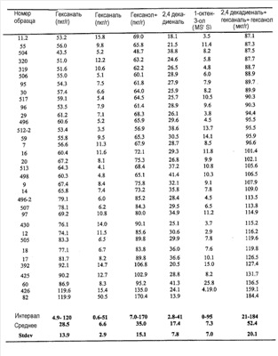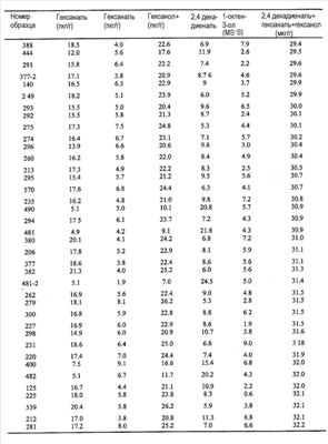 Время анализа для определения указанных компонентов в 175 образцах составило 24 часа. Рассматриваемый метод включал экстракцию и определение с использованием хроматографии/масс-спектрометрии. Количество образца для анализа обычно составляло 0,5 г, но оно может меняться в интервале 0,2-0,7 г. Интервал концентрации запаха в расчете на влажную массу составил 0,2 мкг/г – 120 мкг/г. Приготовление образца из соевой мякоти: Мякоть семени или соевого боба использовали в качестве образца. Примерно 6-12 произвольно отобранных семян или эквивалентную массу кусочков соевой мякоти из образца измельчали на шаровой мельнице при скорости вращения 1200 оборотов в минуту (об/мин) в течение 1 минуты с получением тонкоизмельченной муки. Шаровая мельница для размалывания семян описана в US Patent Pub. 2003/0146313 A1. Использовали такое количество соевой мякоти, чтобы получить примерно 0,5-1,0 г соевой муки к концу измельчения. Свежеразмолотую соевую муку использовали в последующем анализе. Экстракция соевой муки: Свежеразмолотую соевую муку использовали для экстракции ключевых запахов. Примерно 0,5 г (0,48-0,52 г) соевой муки переносили в 20 мл пробирку (VWR TraceCleanTM пробирки, герметизированные прозрачным боросиликатным Тефлоном), снабженную колпачком. Перед заменой колпачка в муку внутри пробирки добавляли деионизированную воду. Содержимое пробирки перемешивали в течение 30 секунд в вихревой мешалке для обеспечения надлежащего гидратирования всей соевой муки в пробирке. Гидратированную соевую муку инкубировали в мягких водных условиях, которые согласно изобретению определяются как инкубация в воде при комнатной температуре (22°С) в течение 20 минут. Через 20 минут в пробирку добавляли 11+0,3 г безводного сульфата натрия, после чего добавляли 10 мл 10% раствора метанол:эфир. 30 микролитров стандартного суррогатного (смесь дейтерированных стандартов гексаналя, гексанола и декадиеналя) спайкового раствора добавляли в пробирку перед повторным надеванием колпачка и встряхивали в течение 30-40 минут в шнековом вибраторе со скоростью вращения 200 об/мин. Через 30-40 минут 1 мл метанол:эфирного экстракта помещали в пробирку пробоотборника (пробирка для пробоотборника 7683 НР). В последующем анализе использовали прибор от VWR. Анализ экстрактов соевой муки: Экстракты соевой муки в среде метанол:эфир дополнительно анализировали на Газовом Хроматографе Agilent 6890 (395 Agilent Technologies, Palo Alto CA 94306), снабженном пробоотборником Agilent 7683 и масс-спектрометре Leco с программным обеспечением LECO Chrom TOF (LECO Corporation, St. Joseph, Michigan 49085). Газовый хроматограф также снабжали 10-метровой хроматографической колонкой DB-WAX или DB1701 c толщиной пленки 0,4 или более и ID 0,18 мм (Agilent Technologies). Метанол (высокой чистоты, фирма ЕМ Science) приобретали у VWR (VWR International West Chester, PA 19380), этиловый эфир (безводный) получали от Mallinckrodt (Mallinckrodt Hazelwood, MO 63042). 2,4-декадиеналь, 85% транс (15% цис), 98% гексаналь, 99% гексанол, 98% 1-октен-3-ол, 99% 2-ундеканон, 97% 2-ноненаль и 99% 2,4-нонадиеналь приобретали у Sigma-Aldrich Company (Saint Louis MO 63103). Дейтерированный D12 гексаналь, D13 гексанол и D2 2,4-декадиеналь получали в лабораторных условиях по методике Lin et al. (1999). При анализе образец объемом 1 микролитр вводили в инжектор газового хроматографа. Для хроматографического анализа образцов использовали следующие параметры: параметры колонки: DB Wax или DB 1701 капилляр 10 м х 0,18 мм, 0,4 мм пленочный инжекционный объем: 1ul 