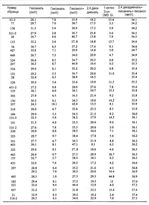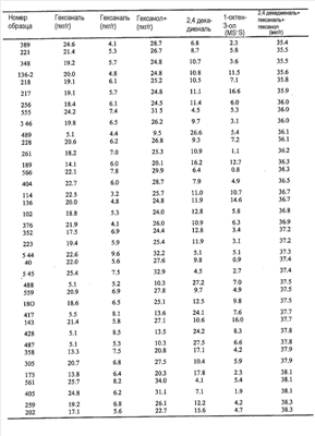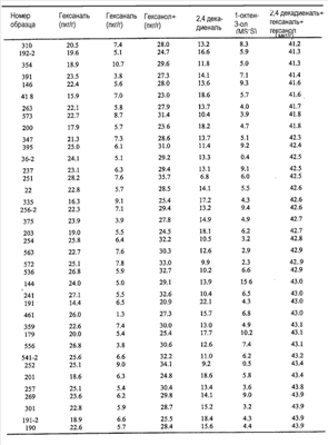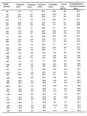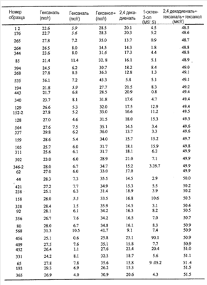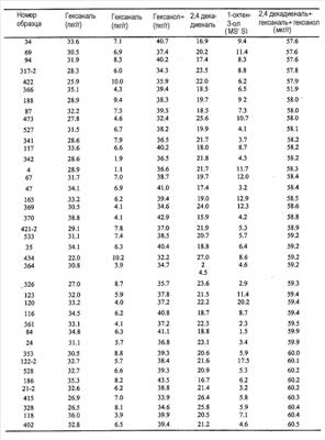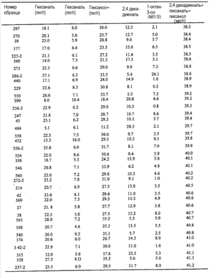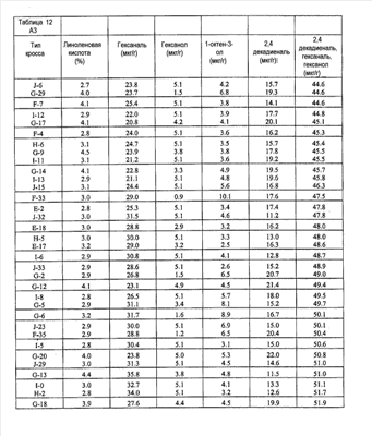 Пример 7 Влияние рН на формирование запаха Стандартный анализ на запах согласно изобретению включает добавление соевой муки в воду, в результате чего появляется запах при рН 6,3. Цель следующего эксперимента заключалась в выяснении следующего: способны ли разновидности сои, продуцирующие слабые уровни запаха при данных условиях, также продуцировать низкие уровни запаха при других значениях рН. Запахпродуцирующие свойства коммерческой контрольной сои сравнивали с линией (А-4), продуцирующей слабый запах. Линия А-4 продуцирует низкие количества декадиеналя и гексаналя при рН 3,0, рН 5,5, рН 7 и рН 9,2 (Таблица 14). Полученные результаты подтверждают возможность использования анализа без буфера в качестве способа селекции сои, способной продуцировать слабый запах в широком интервале значений рН. Наибольшие концентрации гексаналя и 2,4-декадиеналя продуцировались при рН 9, т.е. при таком значении рН, при котором образуется минимальное количество 1-октен-3-ола (Таблица 14).