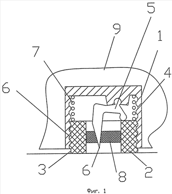 На скользкой поверхности втулка 2 будет ввинчиваться в корпус, 1 что приведет к повороту двуплечего рычага 5 и, следовательно, к выдвижению шипа 6, который тянет за собой упругий элемент 8 и внедряется в скользкую поверхность. Упругий элемент 7 при этом будет сжиматься.