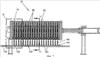 [0035] Фиг.18b показывает фильтровальный пресс Фиг.18а с затворами и скребками в открытом положении. Соседние скребки и затворы выполнены открытыми с противоположных сторон узла фильтровальной платы, обеспечивая пространство для удаления шлама частиц.
