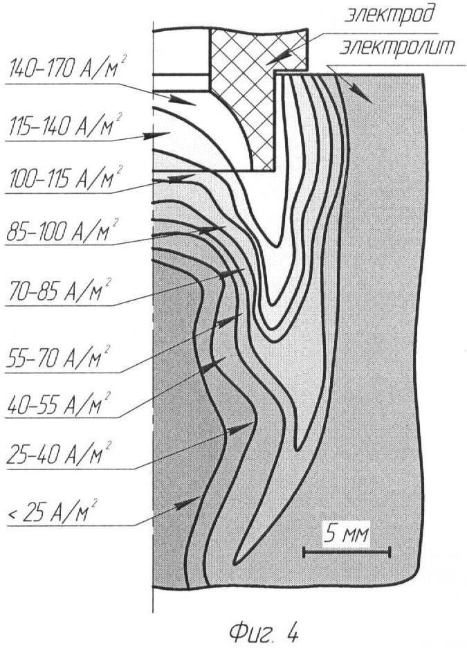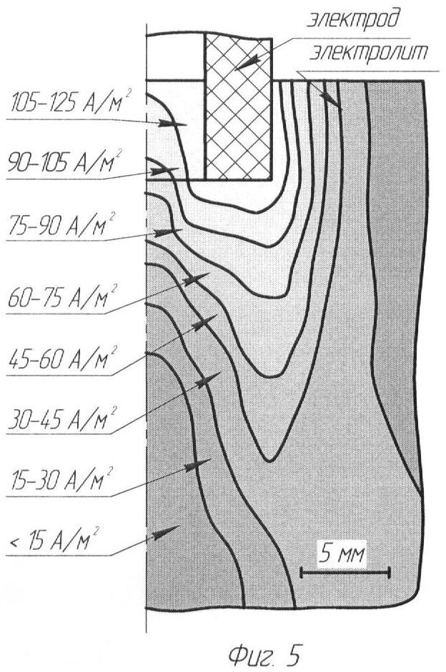 На фиг.4 и 5 изображено распределение плотности тока в модельной среде при использовании электродов с соотношением D/d=2,15 с рабочими участками со сферической полостью и без нее соответственно.