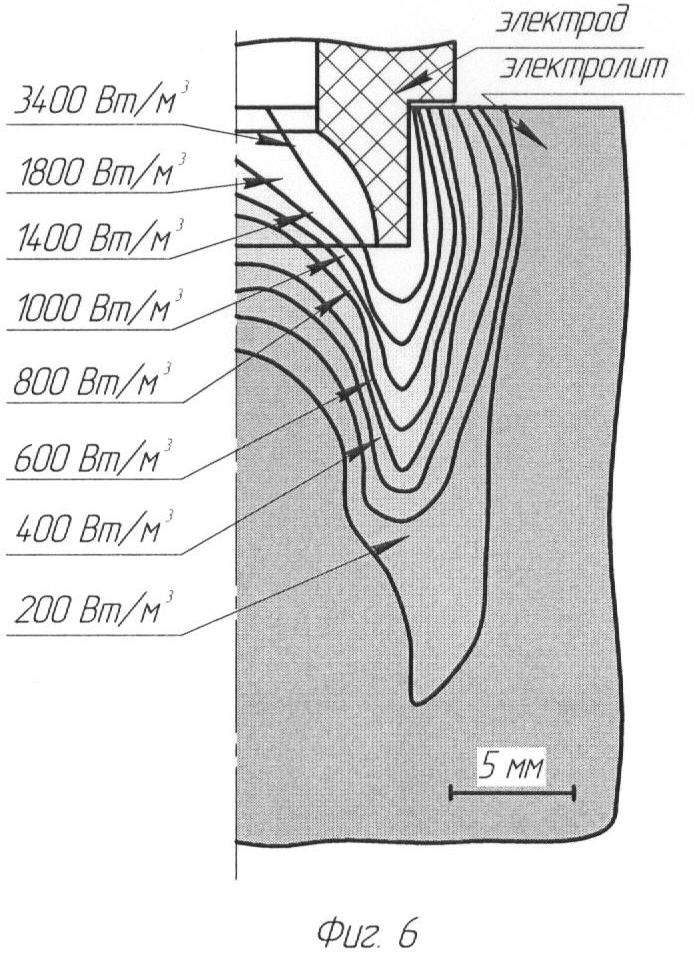 Анализ распределения плотности тока в шлаке, выполненный с помощью методов физического моделирования, показал, что применение электрода с рабочим участком со сферической полостью повышает плотность тока в модельной среде, находящейся внутри сферической полости, до величины 115-170 А/м2 по сравнению с плотностью тока (90-125 А/м2), наблюдаемой при использовании электрода с рабочим участком с цилиндрической полостью (фиг.4, 5). Выбор формы полости осуществляется исходя из величины диаметра осевого канала неплавящегося электрода: при d менее 7 мм с целью снижения трудоемкости изготовления неплавящегося электрода возможно выполнение полости в форме конуса, при d более 7 мм предпочтительнее выполнять полость в форме полусферы.