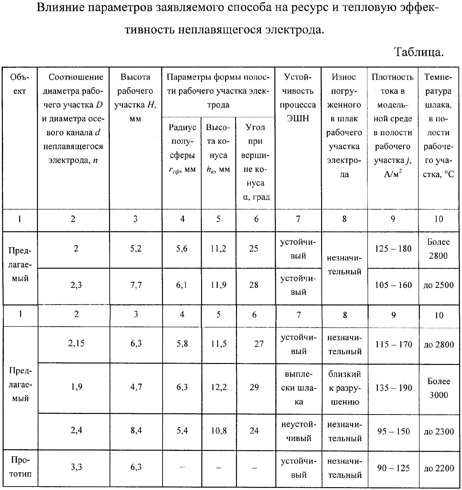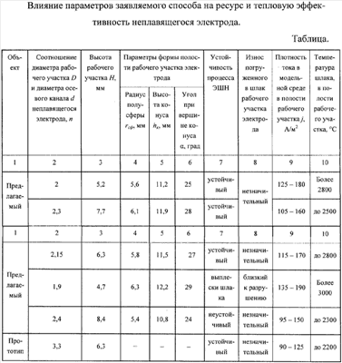Увеличение размеров полости (при rсф>1,75r, hк>3,4r и >28°), так же как и снижение n меньше 2, приводит, с одной стороны, к увеличению плотности тока в приэлектродном и ограниченном полостью объеме шлака, но с другой, к быстрому утонению стенок рабочего участка вследствие процессов электроэрозии, что нарушает геометрические размеры рабочего участка электрода и приводит к его разрушению. Уменьшение размеров полости (при rсф<1,6r, hк<3,2r и <25°), так же как и увеличение толщины стенок рабочего участка электрода (при n больше 2,3) повышает ресурс его работы, но снижает плотность тока в шлаке.