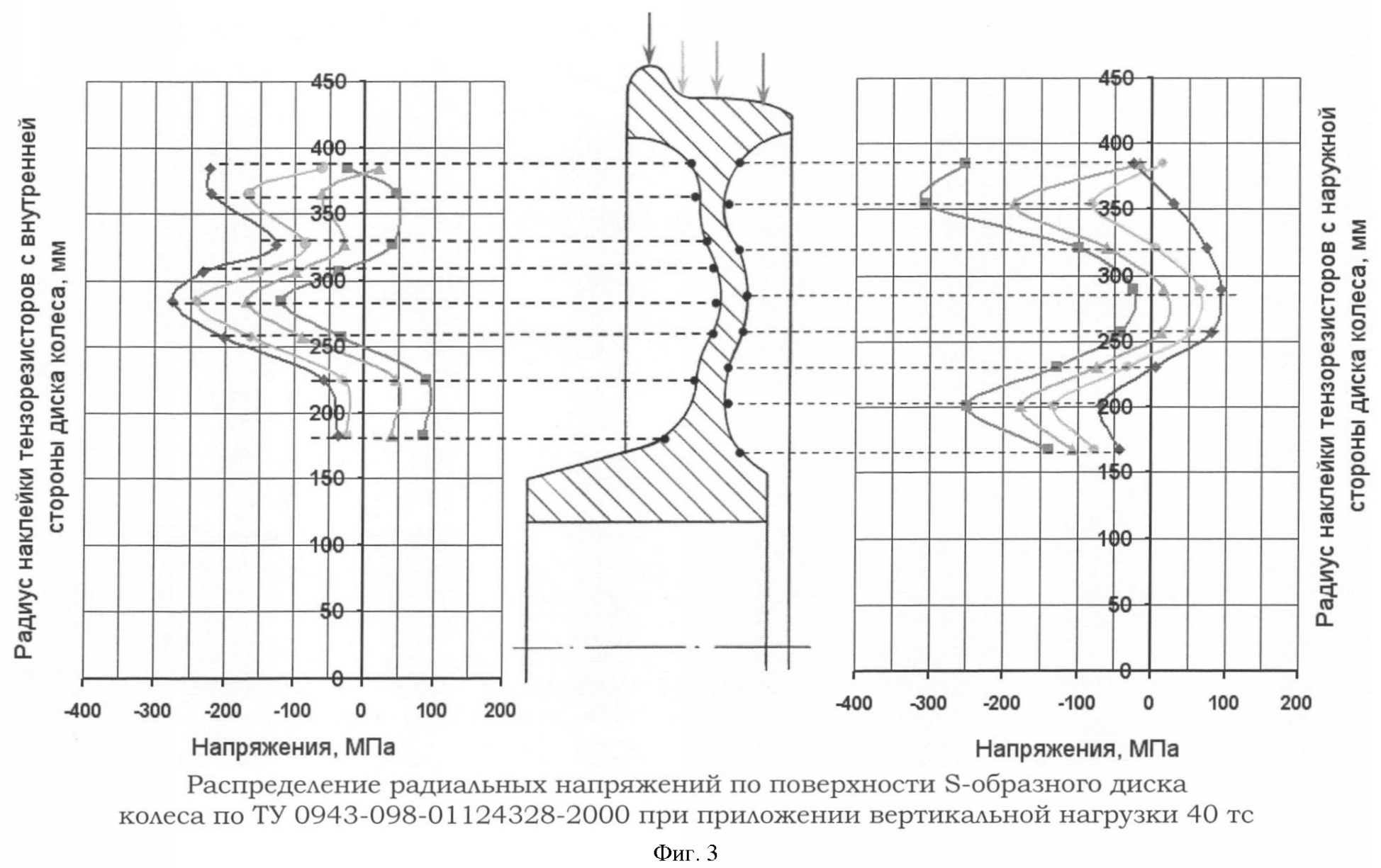Напряженное состояние диска колеса замерялось с помощью тензодатчиков, установленных на поверхности диска. Энергонагруженность колеса при испытаниях соответствовала стандартной испытательной нагрузке 40 тс, вертикально прикладываемой к гребню колеса, что создает в диске соотношение вертикальной и горизонтальной составляющих 1:4 – аналогично эксплуатационному режиму, а также к различным зонам поверхности катания. Исследования показали снижение максимальных действующих напряжений в диске у обода при всех наиболее жестких схемах нагружения по сравнению со стандартным плоскоконическим колесом (таблица 1 и прилагаемые фиг.1-4).