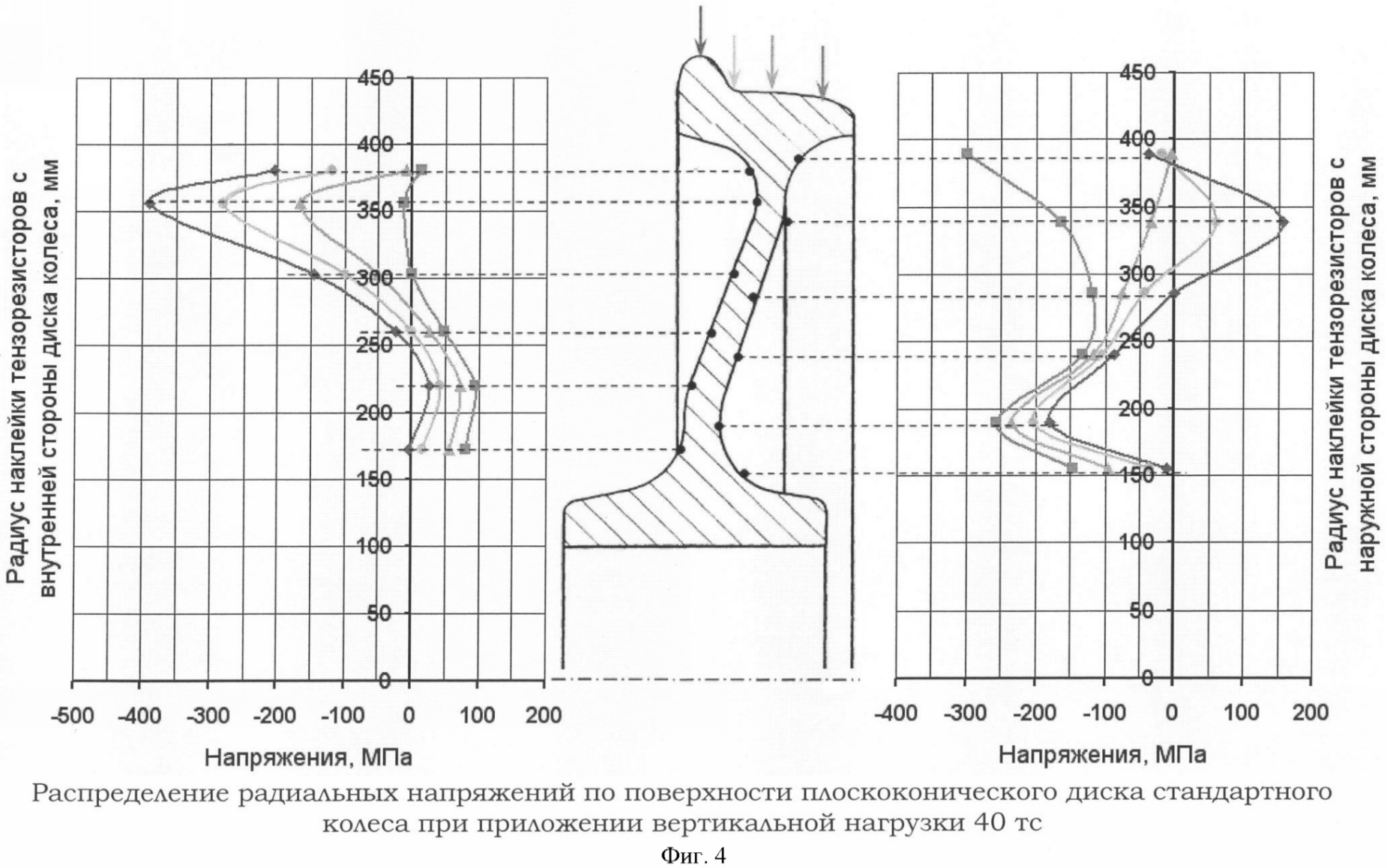 – фиг.4 – распределение радиальных напряжений по поверхности плоскоконического диска стандартного колеса при приложении вертикальной нагрузки 40 тс.