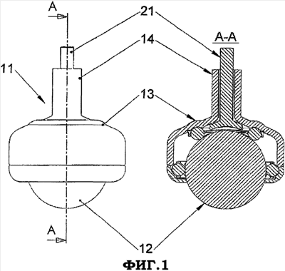 На фиг.1 показано устройство для обеспечения многонаправленного движения, представленное в форме поворотного колеса 11. Это поворотное колесо состоит из сферического шарикоподшипника 12, расположенного внутри корпуса 13, имеющего форму перевернутой чашки, причем ее вершина переходит в вертикальный хвостовик 14.