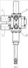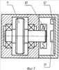 Устройство работает следующим образом. Датчик перемещения, находящийся в датчике загрузки вагона 1, постоянно преобразует информацию о положении вагона в электрический сигнал, этот сигнал обрабатывается микроконтроллером и демпфируется математическим усреднением за определенный период времени, тем самым, сглаживая все кратковременные колебания вагона. Обработанная информация поступает на общую шину по запросу блока сравнения 4. Таким образом, датчик загрузки вагона преобразует линейное перемещение вагона по вертикали в цифровой сигнал, поступающий на общую шину, и один из вариантов выполнения, где в качестве датчика перемещения используется магниторезистивный элемент, приведен на фиг.2 и фиг.3. Приведенный вариант датчика загрузки вагона 1 работает следующим образом. Шток 8, отслеживая перемещения вагона, через вал-шестерню 9 вращает постоянный магнит 10. Изменения направления и напряженности магнитного поля регистрируются магниторезистивным датчиком 11 с двумя мостами и датчиком Холла 12, сигналы с которых поступают в микроконтроллер и там обрабатываются. По одному магниторезистивному мосту возможно однозначное определение угла поворота не более чем на 90°. При использовании двух мостов, повернутых относительно друг друга на 45°, возможный угол поворота возрастает до 180°. Датчик Холла 12 позволяет увеличить однозначное определение угла до угла менее 360°. Увеличение диапазона угла поворота позволяет пропорционально увеличить разрешающую способность датчика перемещения. Блок сравнения 4 через общую шину постоянно опрашивает датчик входного давления 2 и получает от него информацию о режиме торможения или отпуске. В зависимости от данных датчика загрузки вагона 1, датчика входного давления 2 блок сравнения 4 обрабатывает полученную информацию, учитывая в расчетах режим работы, загруженность, тип вагона, и вырабатывает управляющие сигналы, подаваемые на электропневматические клапаны исполнительной части 5, контролируя давление в тормозном цилиндре с помощью датчика давления в тормозном цилиндре 3. В исходном состоянии исполнительная часть 5 имеет: обесточенный электромагнитный клапан отсечки 13, перекрывающий подачу давления из подводящего канала 22 в управляющий канал отсечки 14 и открывающий пневмоуправляемый клапан отсечки 15; обесточенный электромагнитный клапан сброса 16, открывающий подачу давления из подводящего канала 22 в управляющий канал сброса 17 и закрывающий пневмоуправляемый клапан сброса 18. Таким образом давление из канала ВР 19 через открытый пневмоуправляемый клапан 15 поступает в канал ТЦ 20. В режиме торможения при достижении расчетного давления в тормозном цилиндре подается сигнал управления на электромагнитный клапан отсечки 13, открывающий подачу давления в управляющий канал отсечки 14 и закрывающий пневмоуправляемый клапан отсечки 15. Таким образом подача давления из канала ВР 19 через пневмоуправляемый клапан 15 в канал ТЦ 20 прекращается. В режиме отпуска тормозов подается управляющий сигнал на электромагнитный клапан отсечки 13, закрывающий пневмоуправляемый клапан отсечки 15, и на электромагнитный клапан сброса 16, закрывающий подачу давления в управляющий канал сброса 17 и открывающий пневмоуправляемый клапан сброса 18. Таким образом давление из канала ТЦ 20 через пневмоуправляемый клапан с