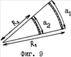 Фиг.7 – расстановка сил, действующих на соединительный элемент между оболочками у аппарата прототипа или иного аппарата, имеющего многослойную оболочку с подъемным газом между слоями, фиг.8 – расправленная наружная оболочка у прототипа или у иного аппарата, имеющего многослойную оболочку с подъемным газом между слоями, вид изнутри с местами подсоединения соединительных элементов, фиг.9 – наглядная демонстрация, что a1>а2, фиг.10 – схема измерения давления в камере манометром с мембраной, фиг.11 – схема измерения давления в камере манометром с жидкостью в трубке, фиг.12 – расстановка сил с учетом всех составляющих давление сил в оболочке с электронами.
