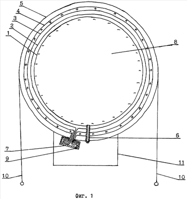 Фиг.1 и ниже: 1 – внутренний слой оболочки, образующий катод аккумулятора, 2 – слой оболочки, образующий сепаратор с электролитом в аккумуляторе, 3 – слой оболочки, образующий анод аккумулятора, 4 – диэлектрический изолирующий слой оболочки, 5 – слой оболочки, образующий корпус аккумулятора, 6 – трубка для заполнения оболочки электронами, 7 – стягивающая планка, 8 – центральная камера с электронами, 9 – клемма на стягивающей планке, 10 – тросы для крепления к грузу на земле или средству транспорта, 11 – гондола или контейнер с грузом,