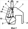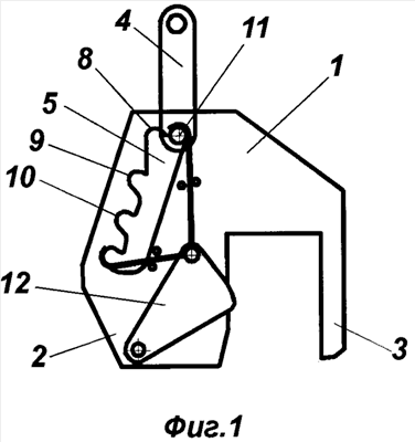 1. Захват-кантователь, содержащий С-образный корпус с двумя лапами и фигурным пазом, серьгу, размещенную в фигурном пазу с возможностью перемещения по нему, эксцентриковый прижим, шарнирно закрепленный на первой лапе корпуса, отличающийся тем, что фигурный паз начинается на середине корпуса и заканчивается на первой лапе, в начале и в конце паза выполнены соответственно первая и вторая фиксированные впадины, вблизи первой фиксированной впадины расположена третья фиксированная впадина, а эксцентриковый прижим оснащен двумя шарнирно прикрепленными к нему тягами, имеющими на конце крюк для взаимодействия с серьгой, установленными в направляющих корпуса с возможностью движения таким образом, что положение крюка каждой тяги при отведенном от груза эксцентриковом прижиме совпадает с положением соответственно первой и второй фиксированных впадин.