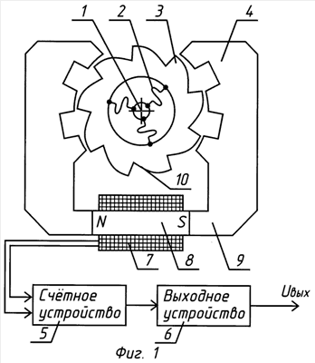 Ротор или активатор 3, с целью определения направления его перемещения, может быть оснащен несимметричными зубцами 10, что дает возможность выявить направление перемещения по разности амплитуд положительных и отрицательных импульсов тока или напряжения (фиг.2, 3), возникающих на катушке 7 во время этого перемещения. В этом случае счетное устройство 5 выполняется реверсивным.