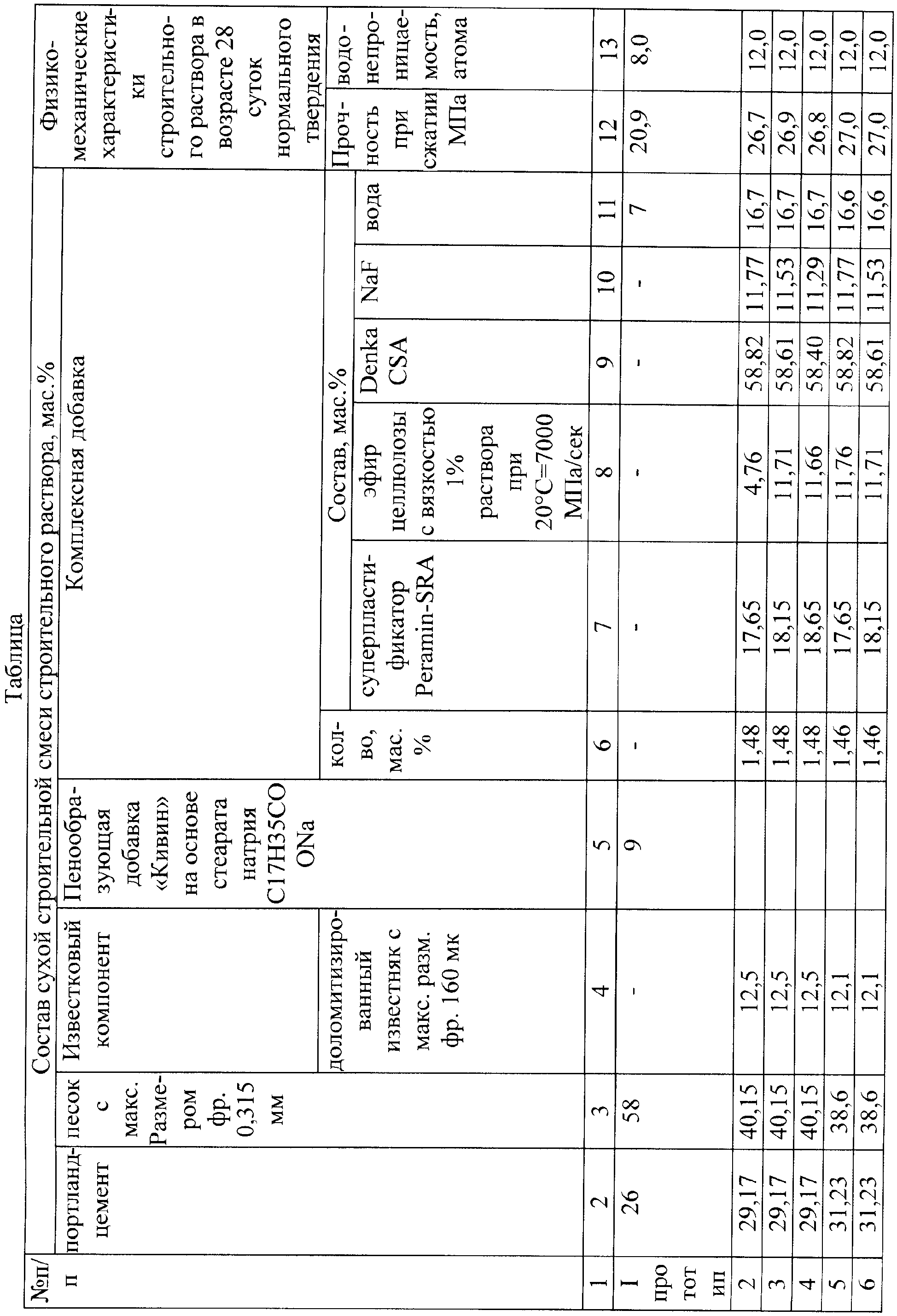 Изобретение относится к составу строительного раствора и может быть использовано в качестве гидроизоляционного состава, используемого в гражданском и промышленном строительстве. Технический результат – повышение прочности при сжатии и водонепроницаемости. Строительный раствор, включающий цемент, песок, добавку и воду, содержит песок с максимальным размером фракции 0,315 мм, комплексную химическую добавку, состоящую из суперпластификатора Peramin-SRA, эфира целлюлозы с вязкостью 1% раствора при 20°С=7000 МПа/сек, расширяющей добавки для цемента Denka CSA и фторида натрия, при следующем соотношении компонентов, мас.%: суперпластификатор Peramin-SRA – 17,65-18,65; эфир целлюлозы с вязкостью 1% раствора при 20°С=1000 МПа/сек – 11,06-11,76; расширяющая добавка Denka CSA – 58,40-58,82; фторид натрия – 11,29-11,77. Строительный раствор дополнительно содержит доломитизированный известняк с максимальным размером фракции 160 мк, при следующем соотношении, мас.%: портландцемент – 29,17-33,3; песок с максимальным размером фракции 0,315 мм – 37,05-40,15; доломитизированный известняк с максимальным размером фракции 160 мк – 11,7-12,5; указанная комплексная добавка – 1,45-1,48; вода – 16,5-16,7. 1 табл.