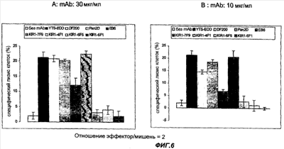 Затем был проведен дальнейший скрининг позитивных моноклональных антител по их способности восстанавливать лизис позитивных по Cw4 клеток-мишеней положительными по ЕВ6 трансфектантами NK, экспрессирующими KIR2DL1. Клетки NK, экспрессирующие ингибиторные рецепторы, специфические к I классу HLA, были использованы как эффекторные клетки против клеток-мишеней, экспрессирующих одну или более из аллелей HLA-C (фигуры 5 и 6). Анализ цитотоксичности проводили, как описано выше. Отношение эффектор/мишень указано на рисунках, антитела использовали при концентрации 10 мкг/мл или 30 мкг/мл.