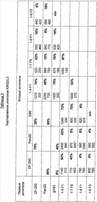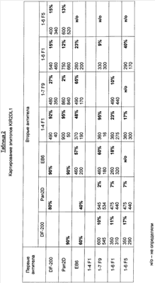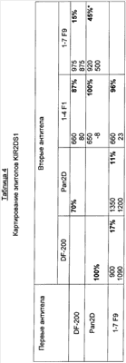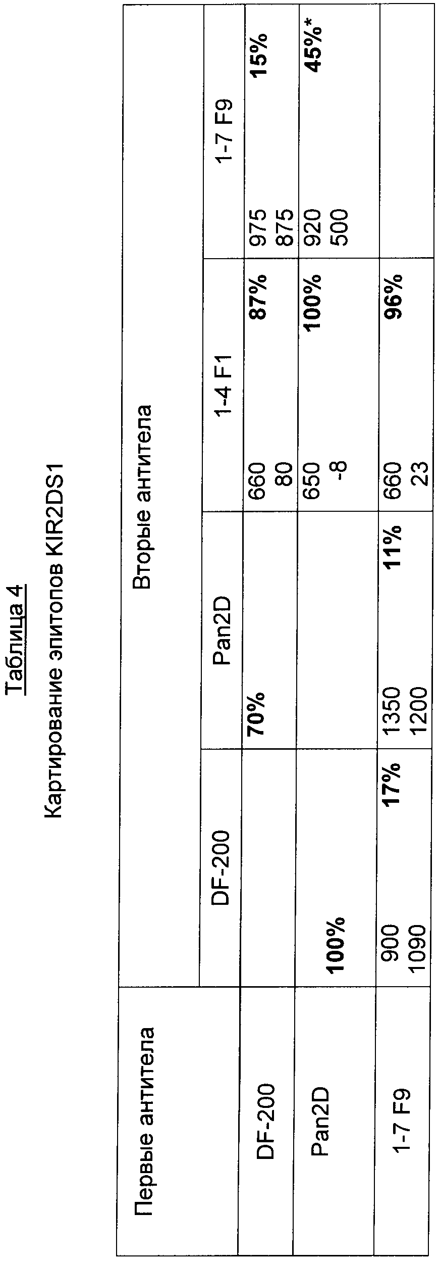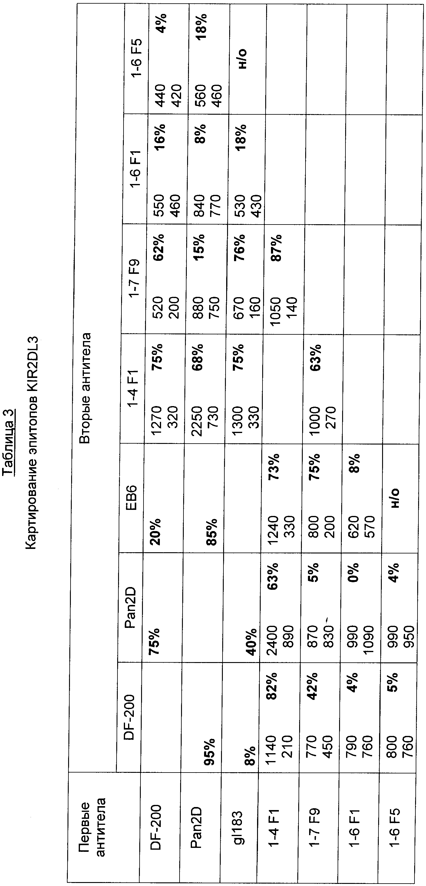 Результаты представлены в таблицах 2, 3 и 4, где антитела, обозначенные как «первые антитела», перечислены в вертикальной колонке, а «вторые антитела» приведены в горизонтальной строке. Для каждой испытанной комбинации антител в таблице приведены значения для уровня прямого связывания (RU) антител с чипом, где прямое связывание вторых антител с чипом KIR2D показано в верхней части ячейки, а значение для связывания вторых антител с чипом KIR2D, где уже присутствуют первые антитела, приведены в нижней части ячейки. В правой части каждой ячейки приведен процент ингибирования связывания вторых антител. Таблица 2 показывает связывание на чипе KIR2DL1, таблица 3 показывает связывание антител на чипе KIR2DL3, а таблица 4 показывает связывание антител на чипе KIR2DS1.