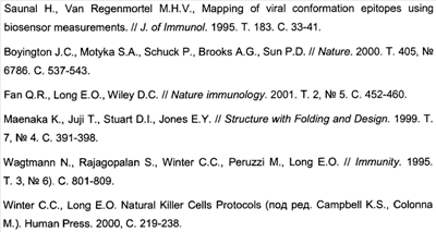Рецепторы KIR – это большое семейство рецепторов, имеющихся на определенных подтипах лимфоцитов, в том числе на клетках NK. Номенклатура KIR основана на числе внеклеточных доменов (KIR2D или KIR3D) и на том, длинный ли (KIR2DL или KIR3DL) или короткий (KIR2DS или KIR3DS) цитоплазматический хвост. У людей наличие или отсутствие данного KIR меняется от одной клетки NK к другой в пределах популяции клеток NK, имеющихся у данного индивидуума. У человеческой популяции имеется также относительно высокий уровень полиморфизма молекул KIR, причем определенные молекулы KIR имеются у некоторых индивидуумов, но не у всех. Некоторые продукты гена KIR стимулируют активность лимфоцитов, связываясь с подходящим лигандом. Все KIR с подтвержденной стимулирующей активностью имеют короткий цитоплазматический хвост с заряженным трансмембранным участком, который ассоциирован с адапторной молекулой, имеющей иммуностимулирующий лейтмотив (immunostimulatory motif, ITAM). Другие продукты гена KIR по своей природе являются ингибирующими. Все KIR с подтвержденной ингибиторной активностью имеют длинный цитоплазматический хвост, и оказывается, что они взаимодействуют с различными подтипами антигенов HLA, в зависимости от подтипа KIR. Во внутрицитоплазматической части ингибиторных KIR проявляются один или несколько ингибиторных лейтмотивов, которые используют фосфатазы. Известные ингибиторные рецепторы KIR включают представителей подсемейств KIR2DL и KIR3DL. Рецепторы KIR, имеющие два домена Ig (KIR2D), идентифицируют аллотипы HLA-C: KIR2DL2 (первоначально его обозначали р58.2) или близко родственный продукт гена KIR2DL3 распознают эпитоп, общий в аллотипах группы 2 HLA-C (Сw1, 3, 7 и 8), тогда как KIR2DL1 (р58.1) распознает эпитоп, общий в аллотипах реципрокной группы 1 HLA-C (Cw2, 4, 5 и 6). Распознавание KIR2DL1 определяется наличием остатка Lys в положении 80 аллелей HLA-C. Распознавание KIR2DL2 и KIR2DL3 определяется наличием остатка Asn в положении 80. Важно то, что подавляющее большинство аллелей HLA-C имеет в положении 80 либо остаток Asn, либо остаток Lys. Один KIR с тремя доменами Ig – KIR3DL1 (р70) распознает эпитоп, общий в аллелях HLA-Bw4. Наконец, гомодимер молекул с тремя доменами Ig – KIR3DL2 (р140) распознает HLA-A3 и HLA-A11.