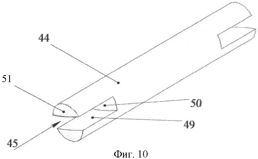 В данной машине также может применяться поршень 8 (фиг.9), выполненный без оси и укомплектованный уплотняющим синхронизирующим элементом 44 более простой формы. Уплотняющий синхронизирующий элемент 44 выполнен в виде цилиндра, на сферических торцах 51 которого имеются два паза 45 под разделитель 9. Поршень 8 (фиг.9) отличается от поршня 8 (фиг.6) тем, что вместо отверстий разных диаметров 30 и 39 имеется только одно сквозное отверстие 30. Уплотняющий синхронизирующий элемент 44 контактирует с разделителем 9 боковой поверхностью паза 49 и дном паза 50, которое имеет сферическую форму (фиг.10).