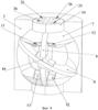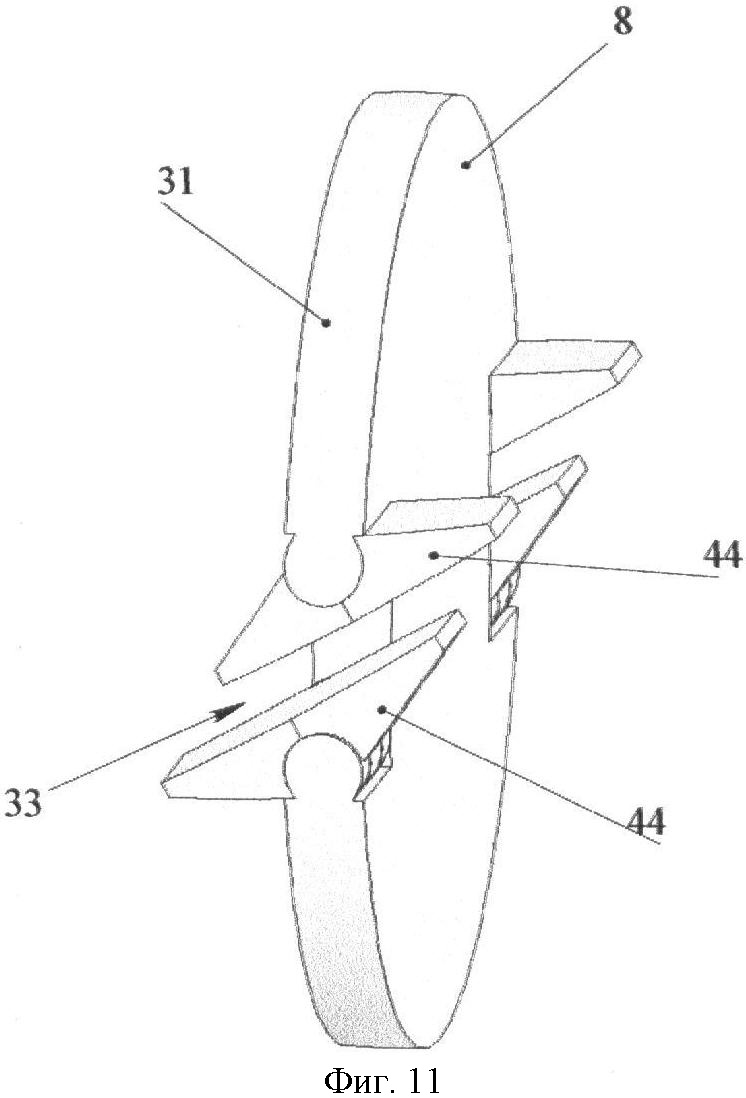 На фиг.8 представлена в изометрии ступень машины со снятой «восходящей» частью корпуса и каналами входа и выхода на роторе (при этом для улучшения понимания соответствующая ей часть разделителя оставлена).