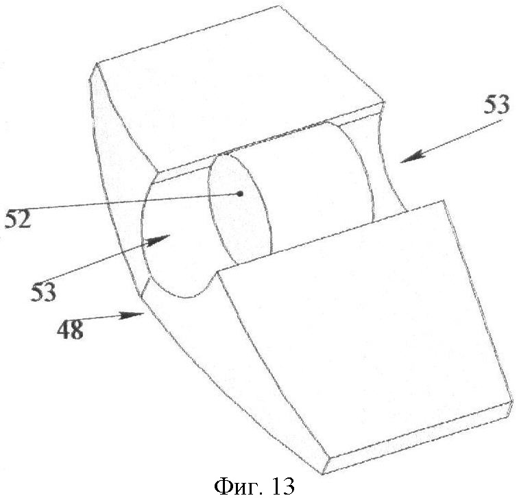 На фиг.11 изображен поршень без оси с уплотняющим синхронизирующим элементом 44 в виде накладок. На боковой поверхности 36 паза 33 поршня 8 имеются два цилиндрических выступа 37 и цилиндрическая выемка 38 (фиг.12). Уплотняющий синхронизирующий элемент с одной стороны имеет два соосных цилиндрических углубления 53, между которыми расположен цилиндрический выступ 52, а с другой стороны плоскую площадку или участок конической поверхности 48 (фиг.13). Ротор 7 для поршня 8 с таким уплотняющим синхронизирующим элементом 44 (фиг.13) имеет выемки 23 под уплотняющий синхронизирующий элемент в виде накладок (фиг.14). Поршень 8 (фиг.12) отличается от поршня 8 (фиг.9) тем, что он не имеет сквозного отверстия 30.
