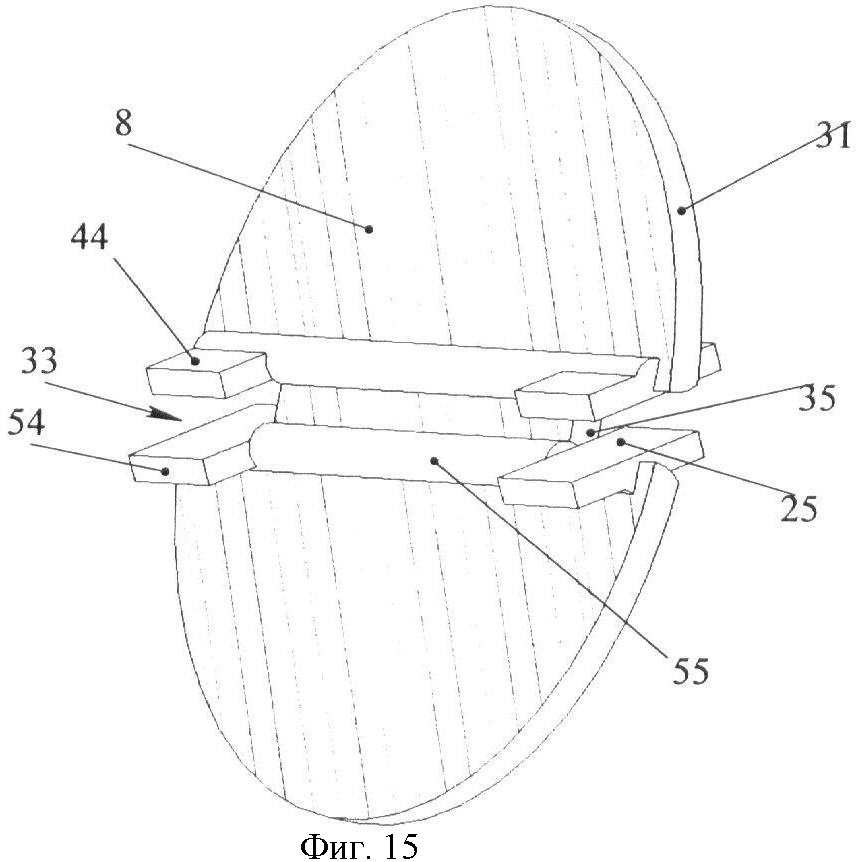 На фиг.15 представлена в изометрии часть поршня с уплотняющим синхронизирующим элементом в виде двух пластинок, соединенных осью.