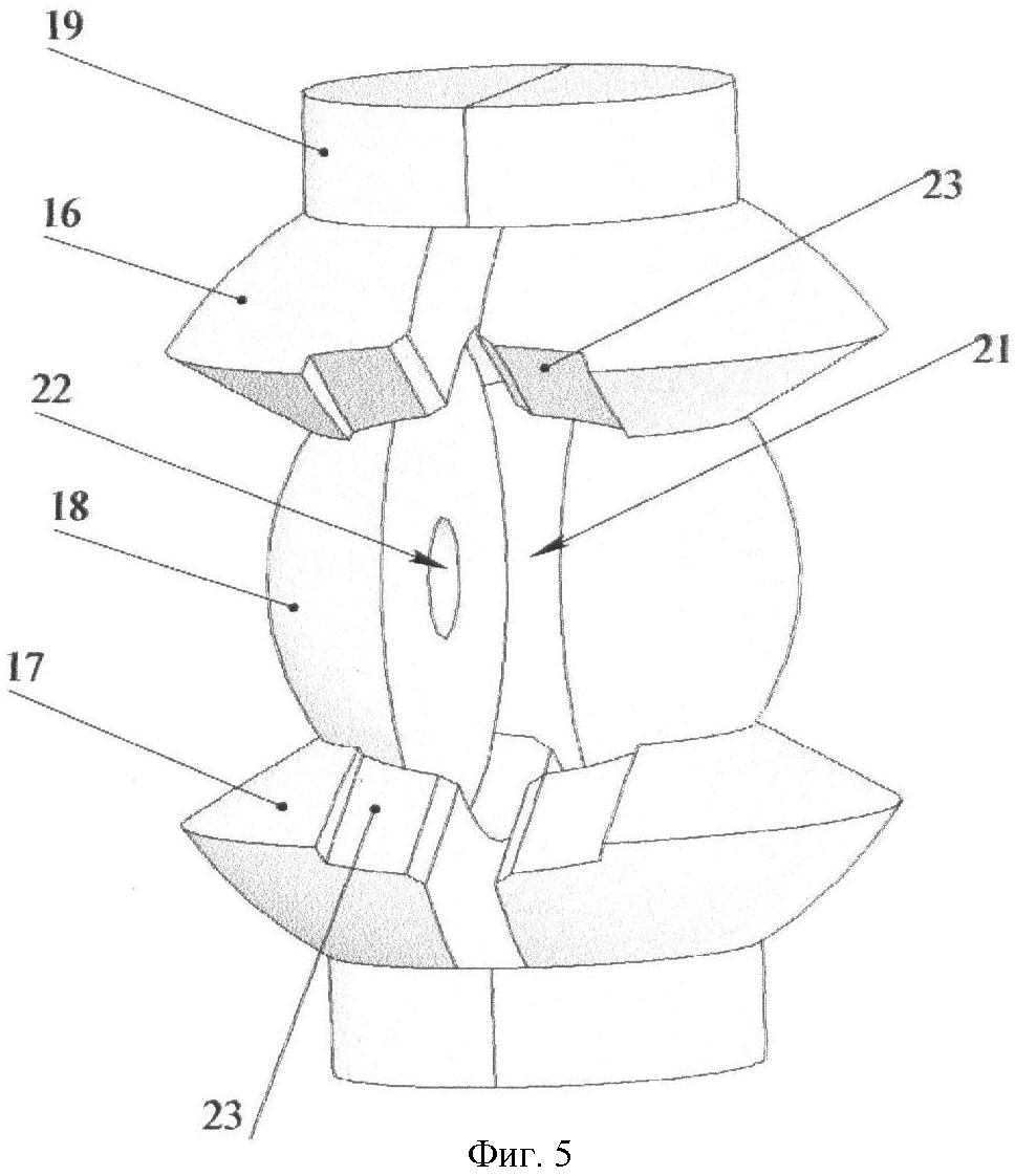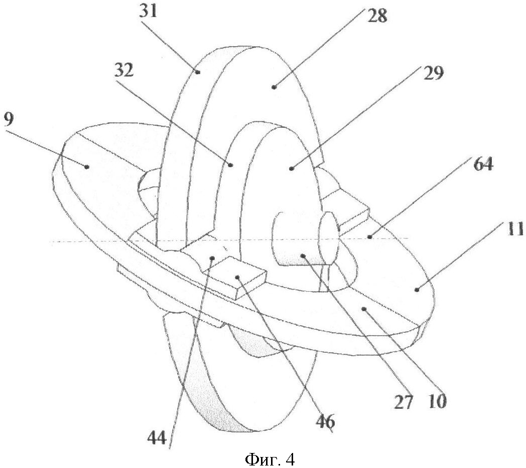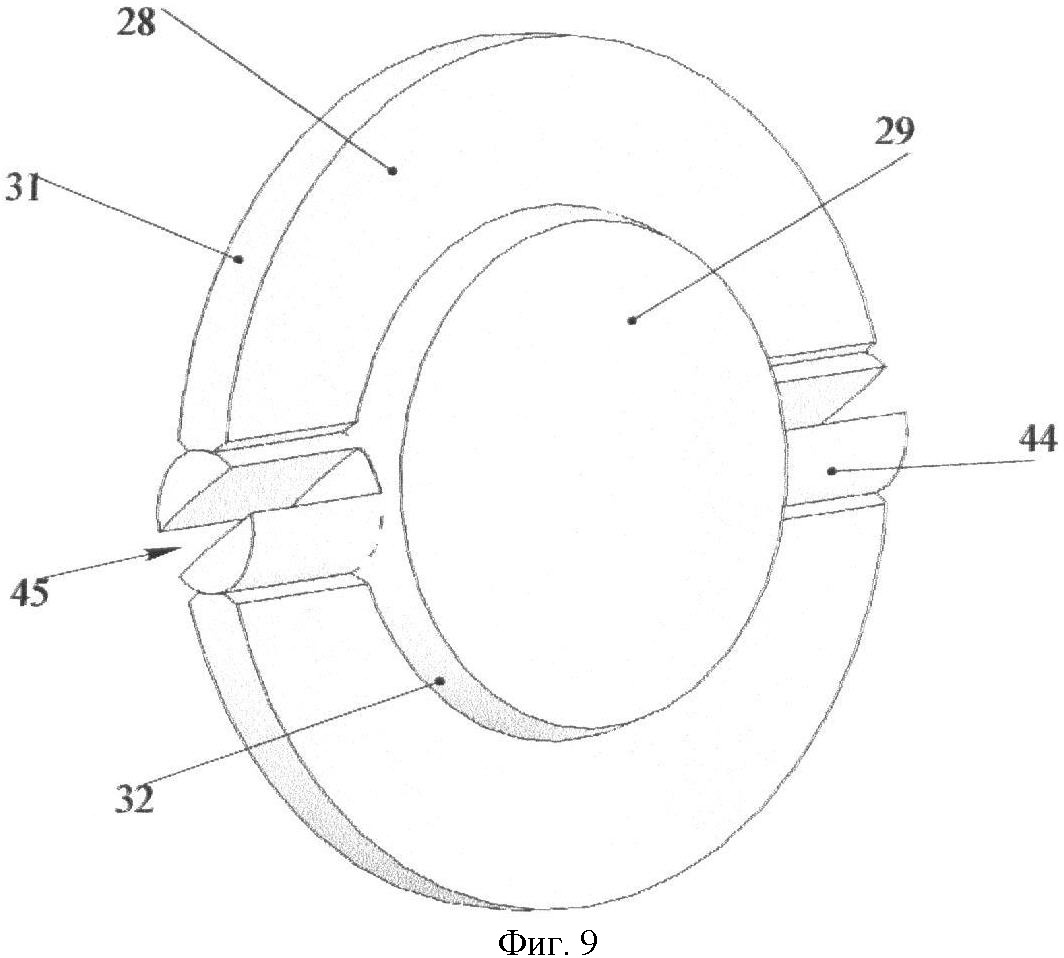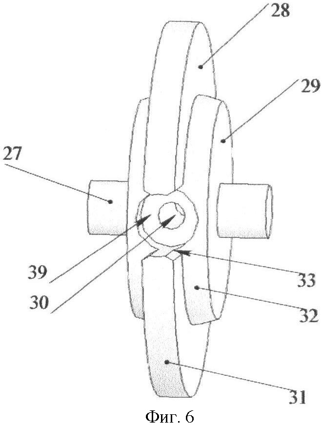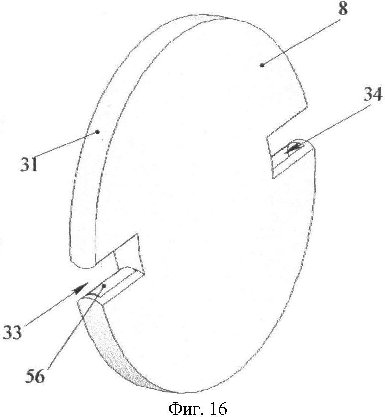 На фиг.19 представлен в изометрии один диск с облегчением и вырезом в поршне, а также уплотняющий синхронизирующий элемент с пазом под крестовину.