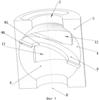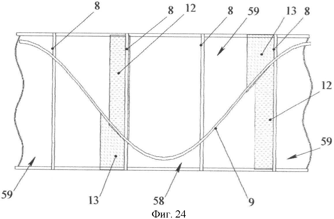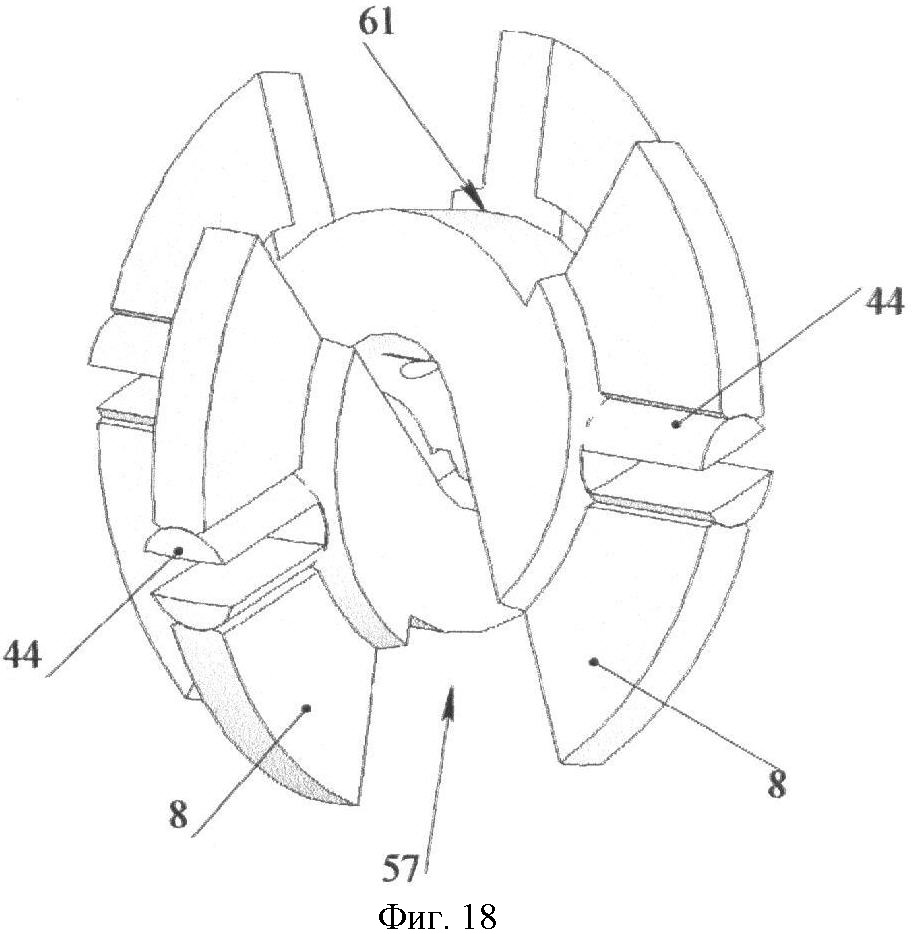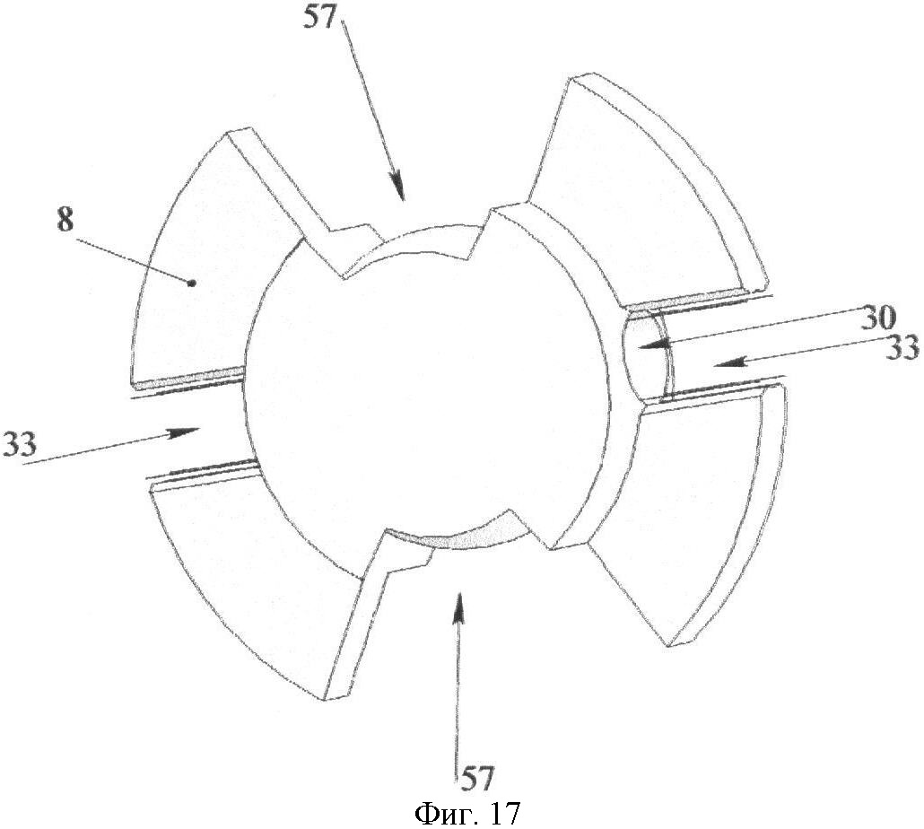На фиг.17 выполнен облегченный вариант поршня 8. Облегчение представляет из себя выборку 57 материала на частях поршня 8, близких к оси 6 вращения машины и удаленных от оси поршня, выборки 57 могут быть несквозными или могут быть заполнены вставками из более легкого материала.