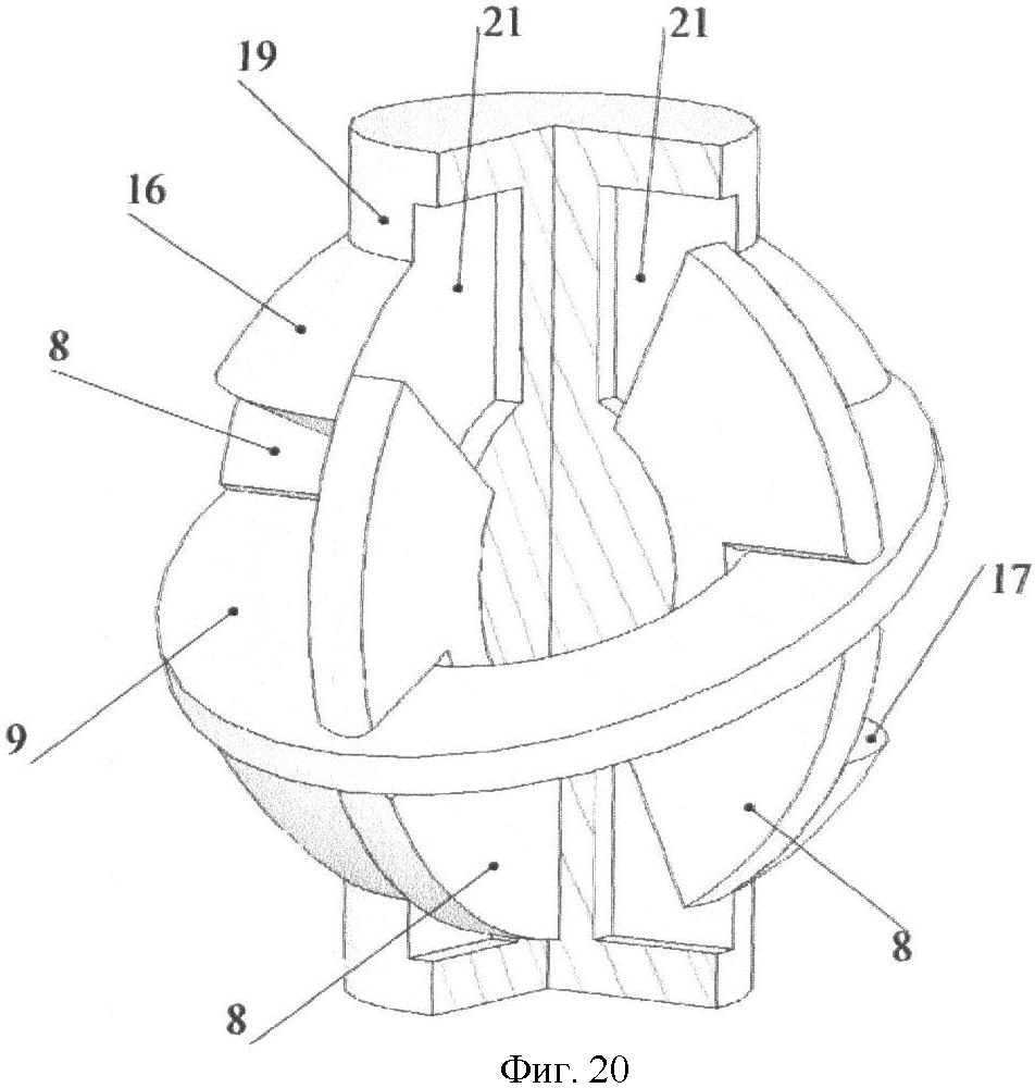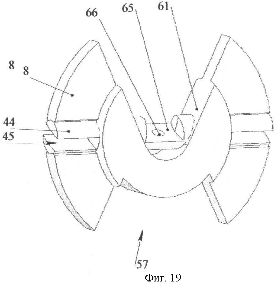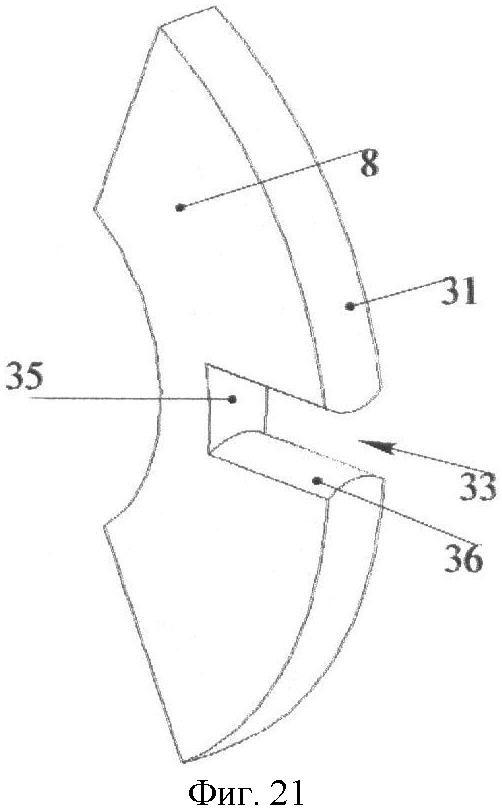Другой способ добавления поршней 8 изображен на фиг.20 – сделать прорези в роторе 7 несквозными и в каждую помещать поршни 8, которые выполнены в виде сектора диска менее 180 градусов (фиг.21). При этом поршни 8 могут удерживаться за счет контакта с разделителем 9 по плоской (конической) поверхности 63 и по сферической (цилиндрической) поверхности разделителя 41 и/или по сферической поверхности корпуса 24.