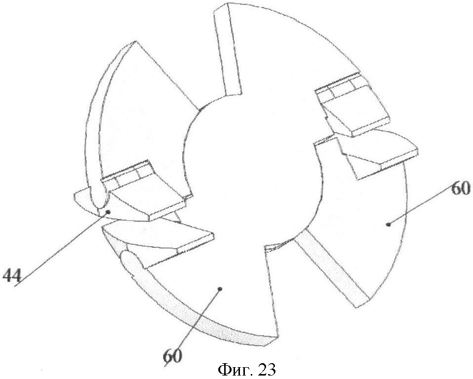 На фиг.22 представлен в изометрии поршень в виде части диска с пазом и уплотняющий синхронизирующий элемент в виде накладок, который может работать с ротором с фиг.20.