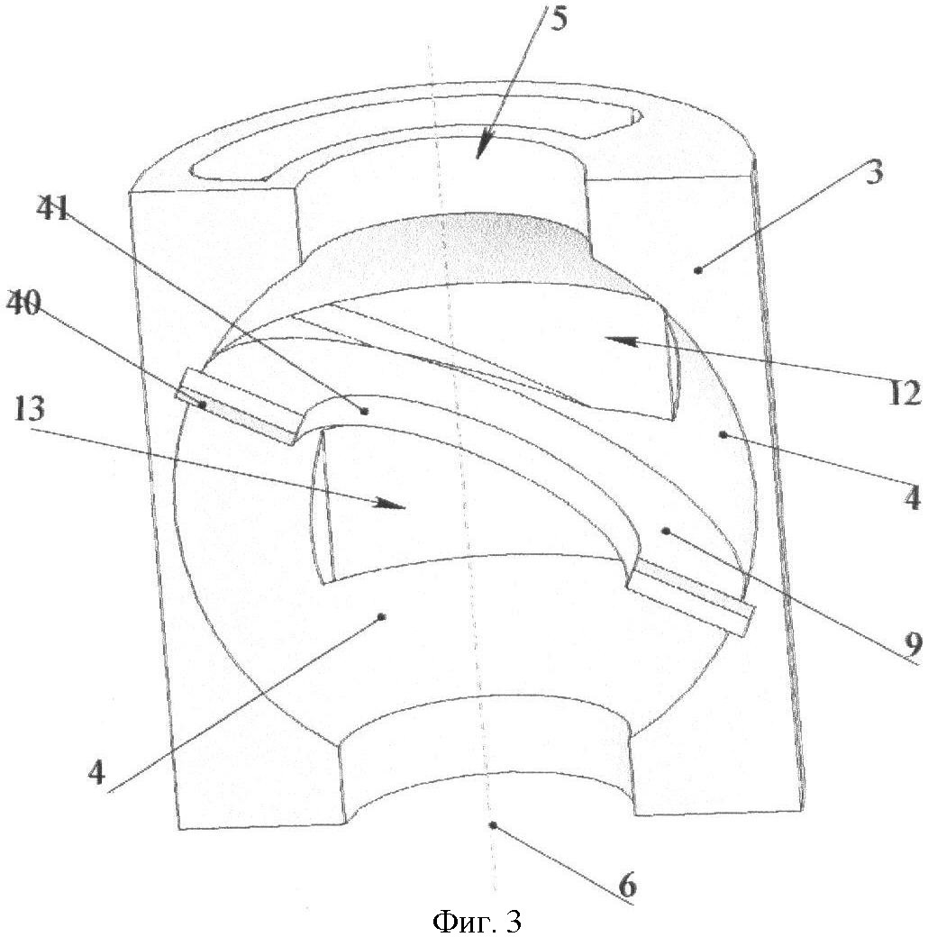 Объемная роторная машина (фиг.1) устроена следующим образом. В корпусе 1 (фиг.2), выполненном из двух частей, условно «восходящей» половины 2 и в основном симметричной ей «нисходящей» половины 3, имеется полость 4 в виде сегмента сферы, из которой имеется концентрическое ей отверстие 5 (фиг.3). В сферической полости 4 под углом к геометрической оси отверстия, являющейся геометрической осью машины 6, установлен разделитель 9, выполненный в виде шайбы с внутренним сферическим отверстием 41 (фиг.1, 3, 4). Для разборности разделитель 9 выполнен из двух частей: условно «восходящей» 10 и «нисходящей» 11, каждая из которых крепится к соответствующим частям корпуса 2 и 3 (фиг.3, 4). В корпусе установлен с возможностью вращения относительно оси 6 корпуса 1 ротор 7 с рабочей поверхностью, выполненной в виде двух поверхностей усеченных конусов 17, опирающихся меньшими основаниями на центральную сферу 18 (фиг.5). Большие основания конусов соединены с концентричными им выходами вала 19 сегментами сферы 16, концентричными центральной сфере 18 и радиусами приблизительно равными радиусу рабочей полости 4. На рабочей поверхности ротора 7 имеется сквозной паз 21 вдоль геометрической оси машины 6 (фиг.5). Для удобства разборки ротор 7 выполнен из двух половинок. Сферической частью корпуса 4, конической частью ротора 17, центральной сферической частью ротора 18 и разделителем 9 образована рабочая полость 20, которую разделитель 9 разделяет на две части (фиг.1). Разделитель 9 касается конической поверхности 17 ротора 7 противоположными сторонами в двух диаметрально противоположных местах (фиг.1). В пазу 21 установлен с возможностью вращательных колебаний вокруг геометрической оси 68, пересекающей перпендикулярно геометрическую ось 6 машины, поршень 8 (фиг.1), выступающий в обе стороны из сквозного паза 21. Поршень 8 выполнен в виде диска, имеющего внешнюю 28 и центральную утолщенную 29 части (фиг.6). Внешняя часть поршня 28 ограничена сферической поверхностью 31, радиус которой приблизительно равен радиусу рабочей полости 4. Переход между внешней частью поршня 28 и центральной частью 29 выполнен по сфере 32, радиус которой приблизительно равен радиусу центральной сферы 21. На внешней части 28 имеются два диаметрально противоположных паза 33 (фиг.6). Через паз 33 по диаметру выполнено цилиндрическое отверстие 39, заходящее на небольшую глубину в утолщенную часть 29 и переходящее далее в сквозное отверстие меньшего диаметра 30. Поршень 8 выполнен зацело с осью 27. В каждом цилиндрическом отверстии 39 поршня 8 установлена часть уплотняющего синхронизирующего элемента 44, выполненная в виде цилиндра 62, торец которого рассечен пазом 45 под разделитель 9. Для увеличения площади боковой поверхности паза 48 на цилиндрической части 62 уплотняющего синхронизирующего элемента 44, рассеченной пазом 45, выполнены выступы 46 (фиг.7). В нерассеченной части уплотняющего синхронизирующего элемента 44 выполнено соосное отверстие под запрессовку штифта. Две части 62 уплотняющего синхронизирующего элемента 44, установленные в двух диаметрально противоположных пазах 45, соединены в одно целое с помощью штифта 47 (фиг.7). Имеются две пары окон входа 12 и выхода 13, причем работающие вместе окна входа 12 и выхода 13 расположены по одну сторону разделителя 9 снизу или сверху вдоль оси ротора 20 и примыкают к месту касания разделителя 9 с ро