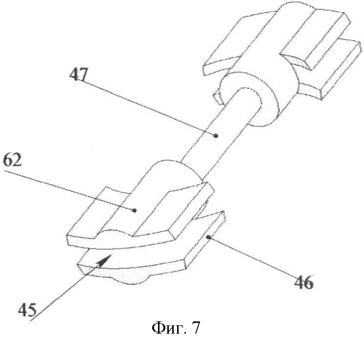 В средней части поршня 8, имеющей облегчение, дополнительно сделан вырез 61. В результате две выступающие части поршня 8 соединены друг с другом одной или двумя дугами, что позволяет пересекать поршни под углом друг к другу и не мешать их колебаниям относительно ротора. Наличие пустоты в центре каждого поршня позволяет стыковать друг с другом оси уплотняющих синхронизирующих элементов 44 в виде крестовины (фиг.19). Для этого в средней части уплотняющего синхронизирующего элемента выполнен паз 65 до середины цилиндра. Для большей жесткости крестовина может через отверстие 66 в пазу 65 уплотняющего синхронизирующего элемента фиксироваться осью.