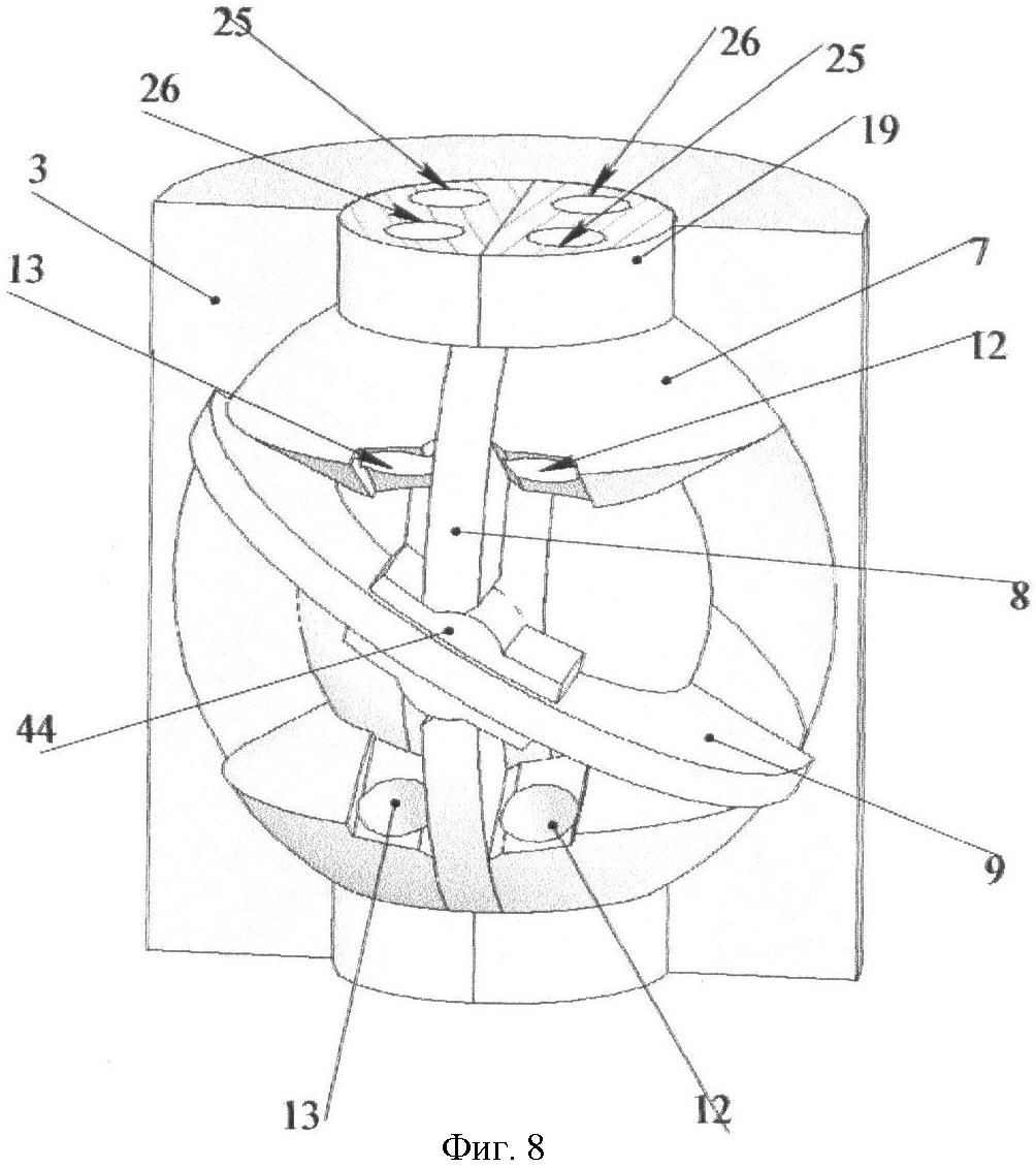 При этом поршни 8 могут удерживаться за счет контакта с разделителем 9 по плоской (конической) поверхности 63 и по сферической (цилиндрической) поверхности 41 разделителя и/или по сферической поверхности 24 корпуса 1.