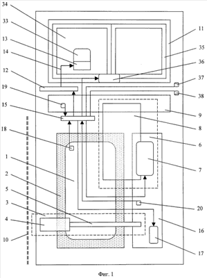 63. Холодильник многофункциональный по п.20, отличающийся тем, что модуль передачи тепла первой камеры для хранения продуктов выполнен в виде закрытой емкости с отверстием, пропускающим в нее воздух первой камеры для хранения продуктов, или наружный воздух, или воздух помещения, заполняемой и опорожняемой жидкой незамерзающей средой из сосуда через трубчатый канал, герметично установленной в теплоизолированном корпусе первой камеры для хранения продуктов таким образом, что одна сторона закрытой емкости контактирует с уличным воздухом, а другая с воздухом первой камеры для хранения продуктов, регулирующее устройство по сигналу задатчика с помощью исполнительного устройства рабочего блока системы использования природного холода наружного воздуха обеспечивает подачу из сосуда и поддержание определенного количества жидкой незамерзающей среды в полости закрытой емкости, обеспечивая необходимый естественный теплообмен между воздухом в первой камере для хранения продуктов и наружным воздухом через стенки закрытой емкости и жидкую незамерзающую среду.