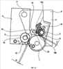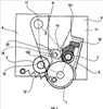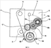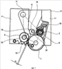 Кроме того, узел 8 барабана снабжен на ведущей стороне по направлению установки шестерней 17 подвижного элемента, которая является вращаемой. Шестерня 17 расположена на продольном торце вала 14. Шестерня 17 находится в зацеплении с шестеренчатой частью 10с блока 10 приема движущей силы через промежуточную шестерню 18. Количества зубьев шестерни 17 и шестеренчатой части 10с равны друг другу, а более точно, составляют 16 в этом варианте осуществления. Посредством этого, когда шестеренчатая часть 10с проворачивается на один полный оборот, шестерня 17 также проворачивается на один полный оборот. Таким образом, частоты вращения блока 10 приема движущей силы и вала 14 соответствуют друг другу. Вал 14 вращается посредством вращения шестерни 17. Вращение вала 14 вращает кулачок 19. Кулачок 19 зафиксирован на одном и другом концах вала 14. В этом варианте осуществления блок 10 приема движущей силы имеет место в виде соединения (соединения картриджа). Соединение содержит первый выступ 10а и второй выступ 10b выступающие вперед по направлению установки. Первый выступ 10а и второй выступ 10b в виде дуг имеют одинаковые радиусы, но разные углы изгиба. Первый выступ 10а и второй выступ 10b выставлены в виде вилки. Угол изгиба первого выступа 10а составляет 150°, а угол изгиба второго выступа 10b составляет 90°.