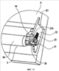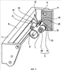 Прижимная сила пружины 110 задана, чтобы формировать минимальную прижимную силу для предоставления возможности скользить части 108 передачи. С другой стороны, по направлению вращения вращающегося вала 109, часть 108 передачи и вращающийся вал 109 вращаются как одно целое посредством зацепления между частью 108а отверстия и выступом 109а. Вращающийся вал 109 с возможностью вращения опирается на металлическую пластину 113 через элемент 112 подшипника. Элемент 112 подшипника и металлическая пластина 113 предусмотрены в основной сборке устройства 99. Вращающийся вал 109 соединен с шестерней 114, так что вращающийся вал 109 и шестерня 14 вращаются как одно целое. Шестерня 114 находится в зацеплении с шестерней электродвигателя (не показана). Основная сборка устройства 99 снабжена датчиком (не показан) для определения угла поворота шестерни 114 при 0° и при 180°.