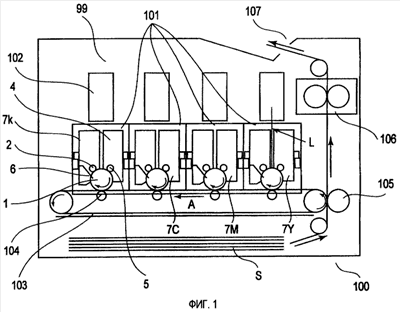 В электрофотографическое устройство 100 (фиг.1) формирования изображения технологический картридж 7 устанавливается съемным образом согласно варианту осуществления настоящего изобретения. Основная сборка устройства 99 устройства 100 формирования изображения снабжена четырьмя частями 101 установки картриджа для установки съемным образом картриджей (7Y, 7М, 7С, 7Bk). Части 101 установки скомпонованы параллельно в горизонтальном направлении, когда основная сборка устройства 99 закреплена. Каждый из картриджей 7 (7Y, 7М, 7С, 7Bk) содержит один электрофотографический фоточувствительный барабан. Картридж 7Y вмещает желтый проявитель. Картридж 7М вмещает пурпурный проявитель. Картридж 7С вмещает голубой проявитель. Картридж 7Bk вмещает черный проявитель. В этом варианте осуществления проявителем является немагнитный однокомпонентный тонер. Картриджи 7 скомпонованы в порядке 7Y, 7М, 7С и 7К сверху по потоку по направлению вниз по потоку относительно направления последовательности операций формирования изображения, а именно направления, указанного стрелкой А, то есть в направлении перемещения транспортной ленты 103, которая будет описана ниже. Фоточувствительный барабан 1 вращается в направлении по часовой стрелке частью 120 (фиг.3) передачи привода, предусмотренной в основной сборке устройства 99. Возле фоточувствительного барабана 1 предусмотрен зарядный валик 2, узел 102 сканера, проявочный 4 узел и транспортная лента 103 в порядке, названном по направлению его вращения. Зарядный валик 2 приведен в соприкосновение с фоточувствительным барабаном 1 для равномерного заряда периферийной поверхности фоточувствительного барабана 1. Узел 102 сканера проецирует лазерный пучок L на периферийную поверхность фоточувствительного барабана 1 на основе информации изображения. Как результат, на периферийной поверхности фоточувствительного барабана 1 формируется электростатическое скрытое изображение, соответствующее информации изображения. Проявочный узел 4 с возможностью вращения поддерживает проявочный валик 5. Проявочный валик 5 проявляет электростатическое скрытое изображение с помощью проявителя. Транспортная лента 103 вращается, прикасаясь к фоточувствительному барабану 1. Проявленное изображение, подготовленное на фоточувствительном барабане 1 средством проявки, электростатическим образом переносится на транспортную ленту 103. Средство 6 очистки удаляет проявитель, оставшийся на периферийной поверхности фоточувствительного барабана 1 после переноса изображения. Фоточувствительный барабан 1, зарядный валик 2, проявочный узел 4 и средство 6 очистки образуют единое целое (картридж).