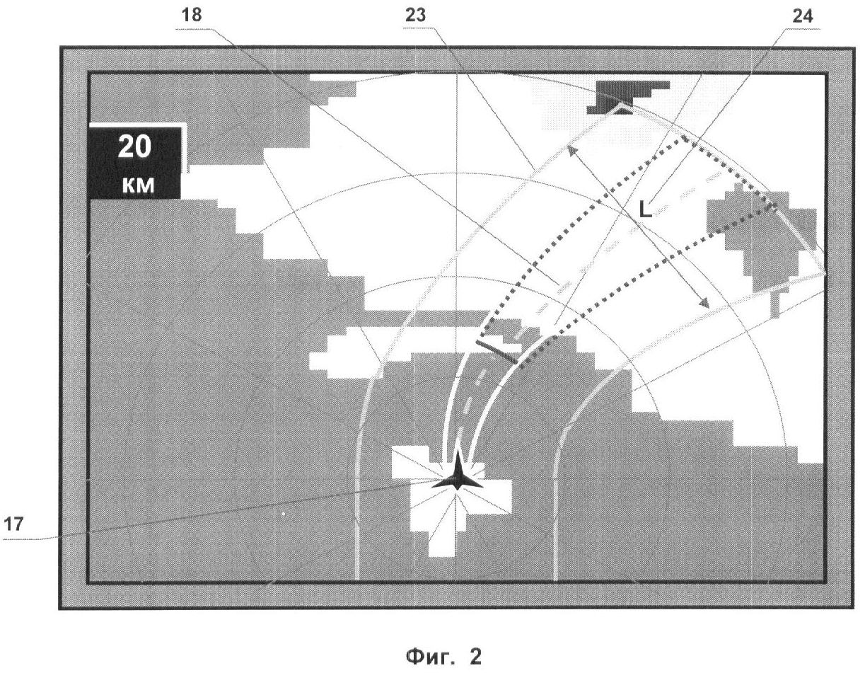 Пересчет конфигурации границ безопасного коридора 23 осуществляется с темпом, необходимым для обновления информации, и, таким образом, безопасный коридор 24 с шириной L формируется адаптированным к текущему динамическому состоянию ЛА, к этапу и режиму выполняемого полета.