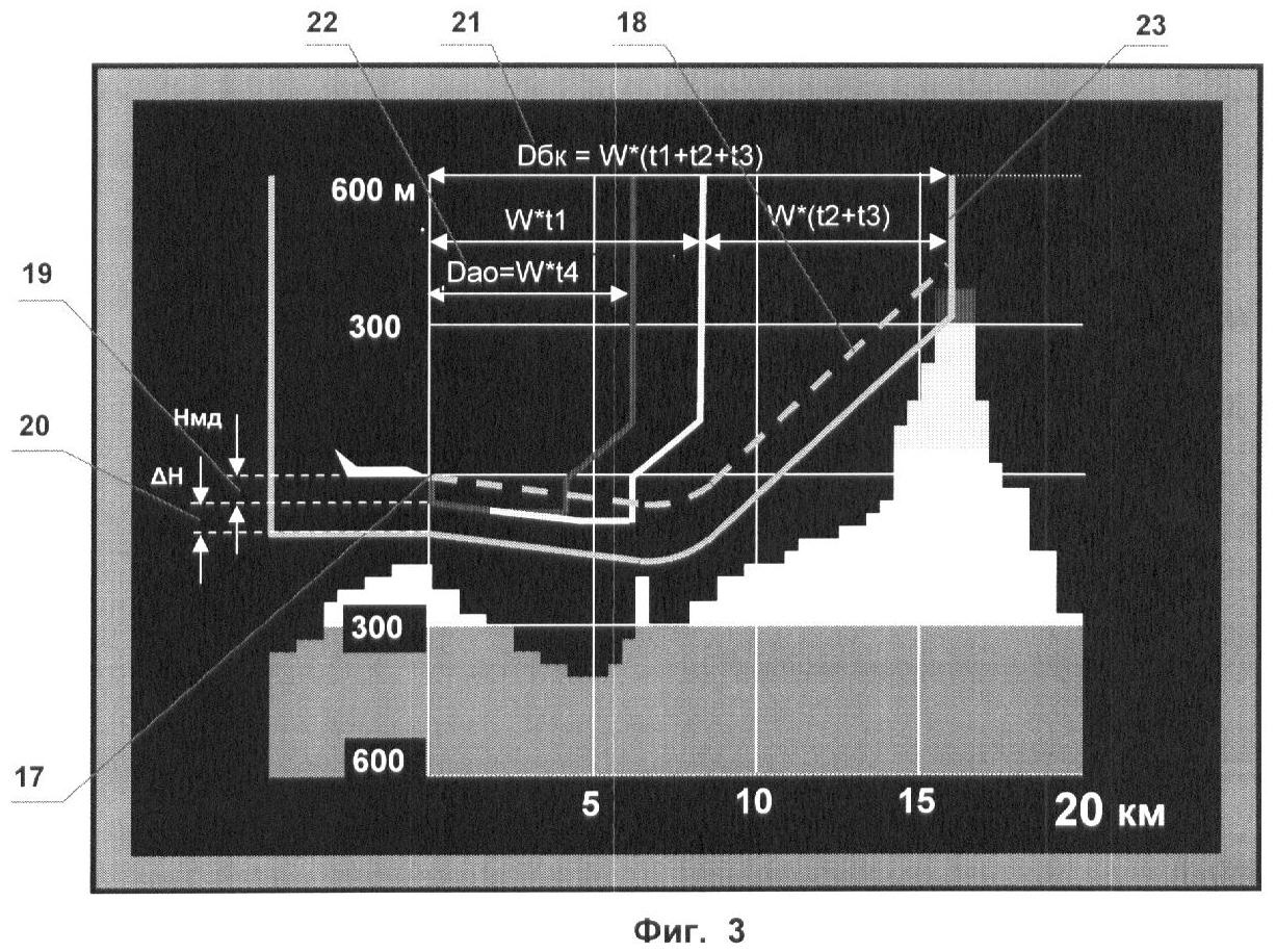 БК на фиг.2 и 3 представлен соответственно в виде плановой и профильной проекций пространственной области, связанной непосредственно с текущим местоположением ЛА 17 и определяемой (по форме и ориентации в пространстве) прогнозируемой траекторией 18. Зависимость параметров БК от параметров движения ЛА (текущих и прогнозируемых минимально допустимых радиусов разворота, максимальной ошибки определения местоположения ЛА, минимально безопасного бокового расстояния ЛА от рельефа местности, путевой скорости, вертикальной скорости, путевого угла, угловой скорости разворота, минимально допустимой высоты полета Нмд 19 и дополнительного запаса высоты Н 20) подробно описана в [9].