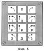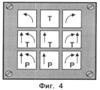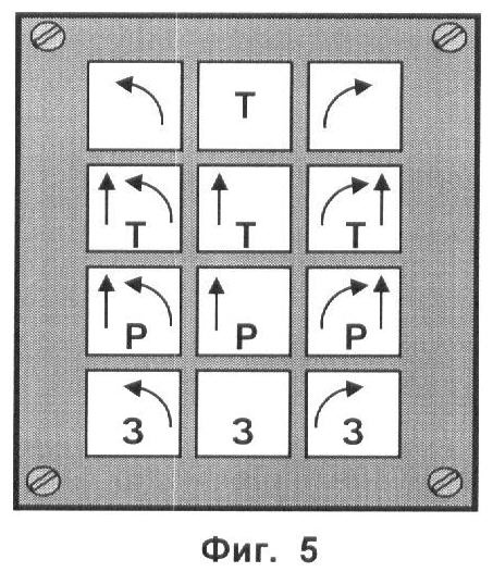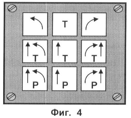 Пример отображения рекомендуемых маневров, показанный на фиг.4, предполагает отображение на матричной панели информации для пилота самолета таким образом, что каждый элемент соответствует одному из возможных вариантов маневрирования по уходу от потенциально опасного рельефа. На элементах левого столбца панели отображают маневры с выполнением левого разворота (обозначается на элементе панели дугой со стрелкой, указывающей направление разворота против часовой стрелки), на элементах центрального столбца панели отображают маневры с прямолинейным движением, а на элементах правого столбца панели отображают маневры с выполнением правого разворота (обозначается на элементе панели дугой со стрелкой, указывающей направление разворота по часовой стрелке), при этом на первом и третьем элементах первой строки матричной панели отображаются маневры, выполняемые без торможения, а на втором элементе – с торможением (обозначается «Т»), на элементах второй строки отображаются маневры, выполняемые с набором высоты (обозначается стрелкой, направленной вверх) и торможением, а на элементах третьей строки отображаются маневры с набором высоты и увеличением мощности двигателя (обозначается «Р»).