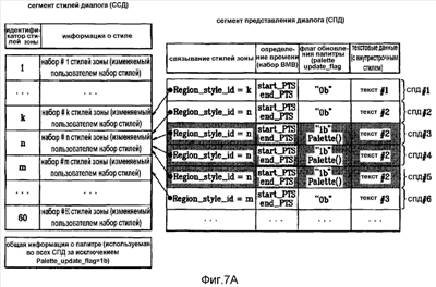 Поэтому, согласно фиг.7А, в СПД #1, СПД #2 и СПД #6 стиль зоны, применяемый к каждому набору текстовых данных (Текстовые данные #1, Текстовые данные #2 и Текстовые данные #3), связывается, соответственно, и применяется к каждому из region_style_id=k, region_style_id=n и region_style_id=m в сегменте представления диалога (СПД). И так как palette_update_flag=0b, используется общая информация о палитре, представляемая из ССД. С другой стороны, в СПД #3, СПД #4 и СПД #5 стиль зоны, применяемый к каждым текстовым данным (Текстовые данные #2), связывается, соответственно, и применяется к region_style_id=n в сегменте представления диалога (СПД). И так как palette_update_flag=1b, применяется информация о палитре, вновь определенная в соответствующем СПД, вместо общей информации о палитре, предоставляемой из ССД. Между тем, информация о стиле, связанная посредством ИД стиля зоны (region_style_id), в равной степени применяется ко всем текстовым данным в соответствующей зоне (т.е. информация о глобальном стиле). Однако когда запрашивается изменение (или модифицирование) информации о стиле для заданной текстовой строки в текстовых данных, определяется и используется информация о внутристрочном стиле, которая представляет собой информацию о локальном стиле, которая применяется только к текстовой строке.