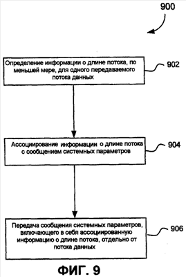 На фиг.9 показана блок-схема примерного способа 900 реализации настоящего изобретения. На фиг.9 способ для передачи информации включает в себя определение данных о длине потока, по меньшей мере, для одного передаваемого потока данных, как показано на этапе 902, и связывание этих данных о длине потока с сообщением системных параметров, как показано на этапе 904. Сообщение системных параметров, включающее в себя соответствующие данные о длине потока, передается отдельно от потока данных, как показано на этапе 906.