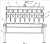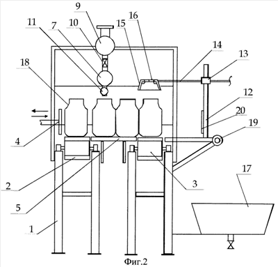 Устройство работает следующим образом. Банки 18 с расфасованными плодами транспортером 2 с определенным шагом подаются к приемному столику банок 5, после чего подводящий транспортер останавливается. После остановки транспортера 2 посредством толкателя 4 банки с плодами (овощами) подталкиваются с транспортера на приемный столик 5, над которым расположен секционный дозатор горячей воды, который после поступления банок на приемный столик обеспечивает подачу горячей воды через патрубки с пробковыми краниками 11 из объемных секционных дозаторов 8. К этому времени на подводящем транспортере накапливается очередная партия банок, которые толкателем 4 подталкиваются на приемный столик. При этом банки, перемещаемые с транспортера, подталкивают уже заполненные водой банки из-под дозатора и на их место становятся следующая партия банок. Находясь на приемном столике, банки с плодами (овощами), залитые горячей водой, нагреваются, а в это время очередная партия банок, находящихся под дозатором, наполняется горячей водой, а на подводящем транспортере накапливается очередная партия банок. При подаче очередной партии банок на приемный столик, последний ряд банок, находящихся на приемном столике, выталкивается на отводящий транспортер банок 3. При этом, после поступления на отводящий транспортер банок, срабатывает механизм для слива воды из банок. Механизм для слива работает следующим образом. Планки 14 с коническим захватом, перемещаясь относительно втулок 13, устанавливаются над банками, далее втулки 13 опускаются относительно стоек 12 до упора горловины банок об резиновое кольцо, установленное в основание конического захвата 15, для предотвращения механического боя банок. После фиксации горловины банок в конических захватах, планки, перемещаясь относительно втулки 13 назад, подталкивают банки до касания их боковой стенкой об упор 20 для банок, прикрепленный к стойкам 12, банки фиксируются в этом положении, после чего механизм для слива воды из банок поворачивается вокруг шарнира 19 на 180°, и при этом через отверстия в основании 16 конического захвата вода из банок стекает и собирается в сборнике 17. После этого механизм для слива воды из банок поворачивается обратно вокруг шарнира 19 и банки устанавливаются на отводящий транспортер и выводятся из устройства. Далее процесс повторяется в непрерывном режиме.
