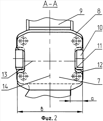 Кроме того, вкладыш 7 выполнен симметрично относительно горизонтальной 13 и вертикальной 14 осей симметрии вкладыша 7, также на наружных углах вкладыша 7 выполнены фаски, при этом катет (а) каждой фаски, расположенный горизонтально, не менее 1/5 ширины (в) вкладыша.
