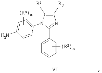 в котором Y, R7 и R8 являются такими, как определено выше, в инертном растворителе, например в толуоле, в присутствии кислоты Льюиса, например триметилалюминия, при температуре в интервале от -25°С до 150°С, когда R10 представляет собой группу С1-6алкил; или альтернативно, когда R10 представляет собой Н, путем взаимодействия соединения формулы III с хлорирующим агентом, например оксалилхлоридом, и затем взаимодействия полученного хлорангидрида с амином формулы IV в инертном растворителе, например в дихлорметане, в присутствии основания, например триэтиламина, при температуре в интервале от -25°С до 150°С. Соединения формулы I, в которых Rа, R1, R2, R4, m и n являются такими, как определено выше, и R3 представляет собой группу X-Y-NR7R8, в которой Х представляет собой SO2, могут быть получены путем взаимодействия соединения формулы V в котором Rа, R1, R2, R4, m и n являются такими, как определено выше, и А представляет собой уходящую группу, например галогено, например хлоро, с соединением формулы IV, в котором Y, R7 и R8 являются такими, как определено выше, или его солью в инертном растворителе, например в ТГФ или дихлорметане, в присутствии основания, например карбоната калия, триэтиламина или пиридина, при температуре в интервале от -25°С до 150°С. Соединения формулы I, в которых Rа, R2, R3, R4, m и n являются такими, как определено выше, и R1 представляет собой группу R5S(O)2NH, могут быть получены путем взаимодействия соединения формулы VI в котором Rа, R2, R3, R4, m и n являются такими, как определено выше, с сульфонирующим агентом формулы R5SO2L, в которой R5 является таким, как определено выше, и L представляет собой уходящую группу, например хлоро, в инертном растворителе, например в дихлорметане, в присутствии основания, например триэтиламина, при температуре в интервале от -25°С до 150°С. Предполагают, что некоторые промежуточные соединения являются новыми и образуют часть настоящего изобретения, в частности соединения формулы III, определенные выше и включающие каждое определение R1, приведенное выше. Соединения формулы II, III, V и VI могут быть получены с помощью общего синтетического пути, показанного в конце примеров, и их адаптаций или аналогичными способами, известными специалистам в данной области. Специалистам в данной области следует понимать, что в последовательности реакций для некоторых функциональных групп будет необходима защита с последующим удалением защиты на соответствующей стадии; см. “Protective Groups in Organic Synthesis”, 3rd Edition (1999) by Greene and Wuts. Фармацевтические препараты Соединения по изобретению будут обычно вводиться путем перорального, парентерального, внутривенного, внутримышечного, подкожного или другого пути инъекции, трансбуккального, ректального, вагинального, чрескожного и/или назального пути и/или путем ингаляции в форме фармацевтических препаратов, содержащих активный ингредиент или его фармацевтически приемлемую соль присоединения в фармацевтически приемлемой лекарственной форме. В зависимости от расстройства и от пациента, подлежащего лечению, а также от пути введения композиции можно вводить в варьирующих дозах. Подходящие суточные дозы соединений по изобретению при терапевтическом лечении людей составляют примерно 0,001-10 мг/кг массы тела, предпочтительно 0,01-1 мг/кг массы тела. Предпочтительными являются пероральные препараты, в частности, таблетки или капсулы, 