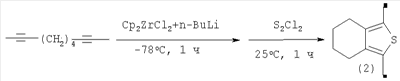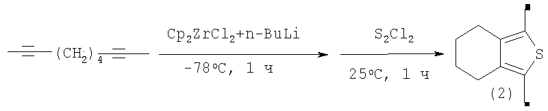, -диацетиленов с последующей обработкой реакционной массы бисциклопентадиенилцирконийдихлоридом (Ср2ZrСl2) и бутиллитием (n-BuLi), с полухлористой серой (S2Cl2) за 1 час по схеме: